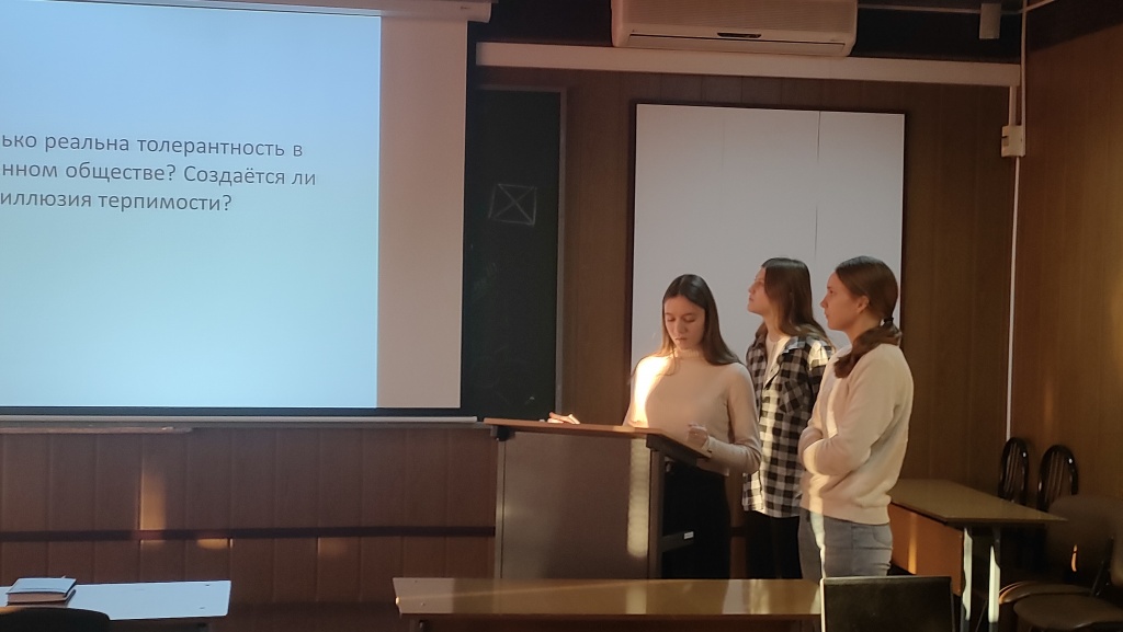 28 ноября на СГФ состоялась проблемная дискуссия на тему «Нравственные императивы толерантного сознания». В ней участвовали студенты факультета, а вела мероприятие заведующая кафедрой гуманитарных и социально-экономических наук Надежда Юрьевна Мочалова. В ходе дискуссии были рассмотрены спорные аспекты религиозной толерантности и затронуты острые темы межнациональных и демографических (межпоколенческих) конфликтов.