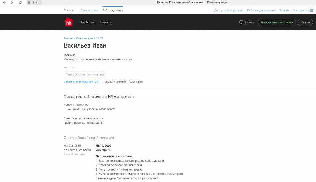 На втором этапе будущие HR-менеджеры должны были внимательно прослушать требования заказчика к кандидату и найти резюме специалиста в открытой базе HeadHunter. Им предлагалось продемонстрировать умение создавать целевые запросы на странице HeadHunter для поиска резюме на основании прямых и косвенных данных, позволяющих найти узкоспециализированных сотрудников.
