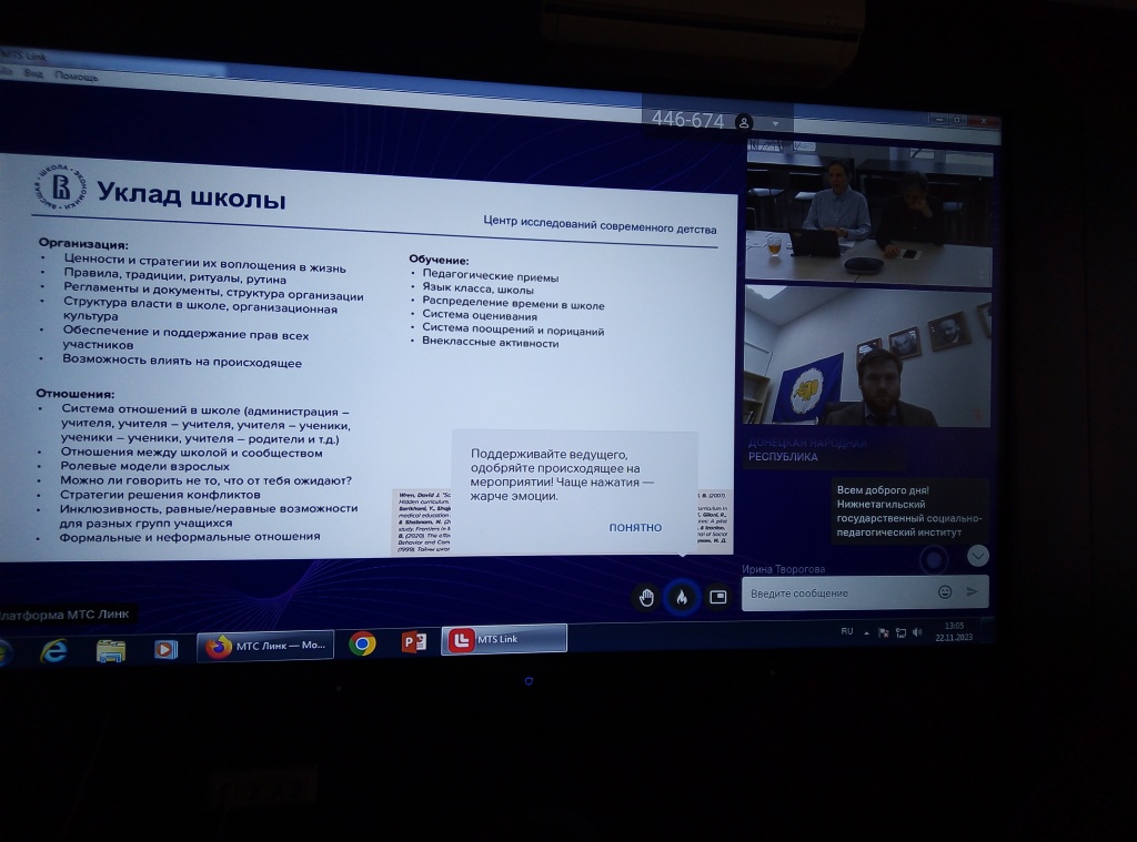 22 ноября начальник отдела научно-исследовательской работы НТГСПИ Е. Г. Харитонова приняла участие в онлайн-семинаре для образовательных организаций всех уровней «Как уклад школы может поддерживать самостоятельность в учебе». Организатор мероприятия – Институт образования Национального исследовательского университета «Высшая школа экономики» (г. Москва) – проводит подобные встречи на постоянной основе в рамках деятельности своей проектно-учебной лаборатории эффективности государственных мер развития образования.