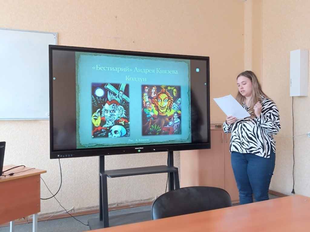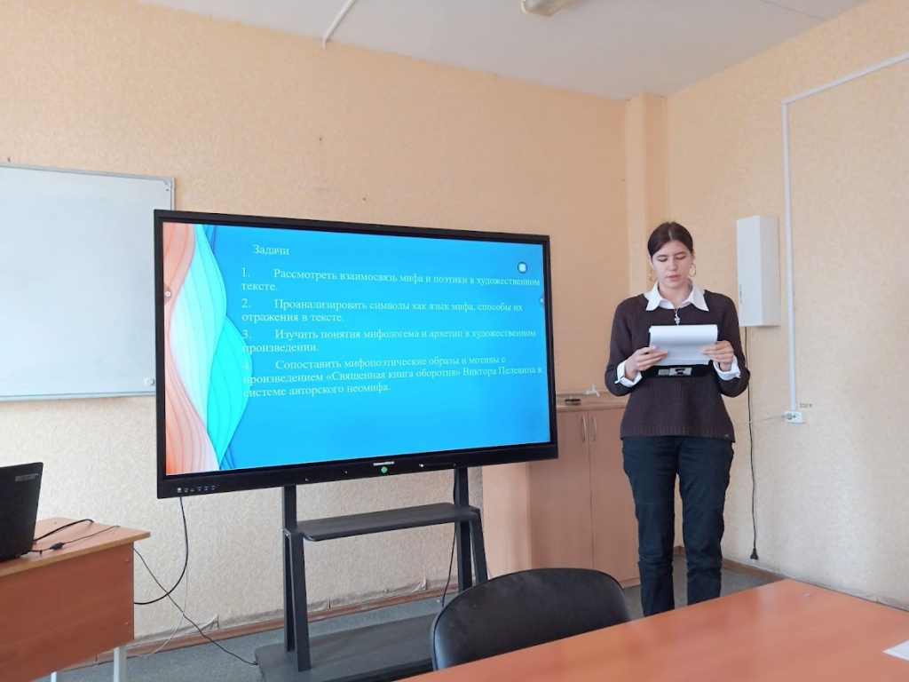 Несмотря на немногочисленный состав присутствующих, работы, представленные для обсуждения, вызвали интерес. Большинство исследований было посвящено отражению мифов (мифологических сюжетов, образов и т. п.) в поэтике современных художественных произведений. В качестве материала для анализа были выбраны произведения В. Пелевина, А. Князева, Р. Риордана.