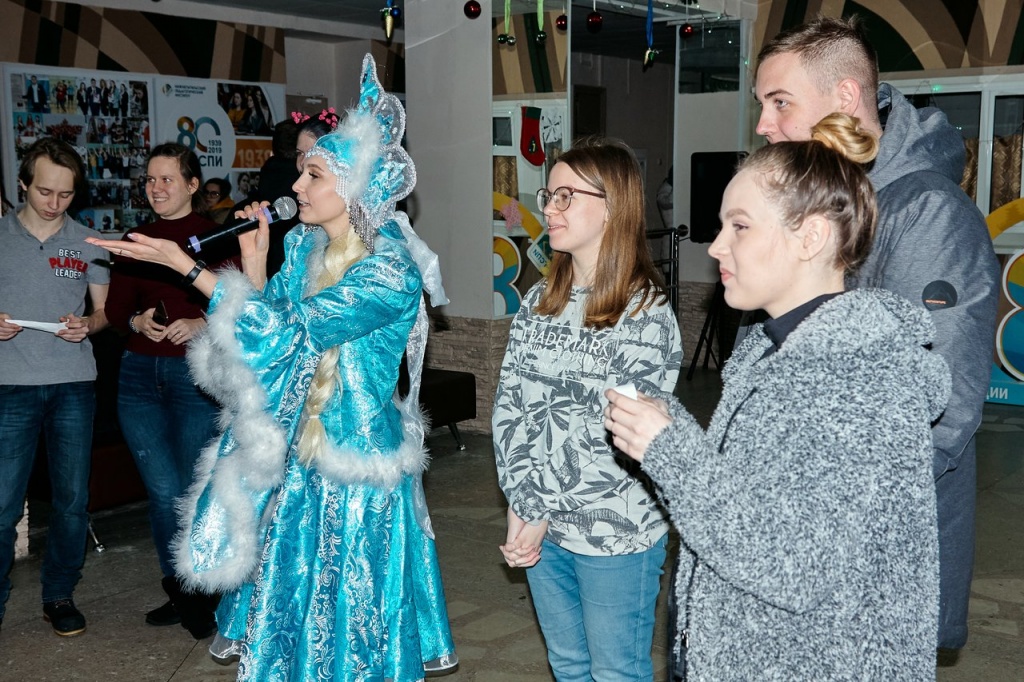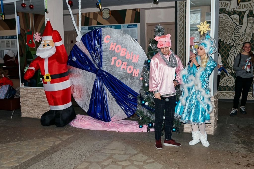 Открытие началось с инсценировки. Снегурочка потеряла своего друга Хрюшку, а ребята помогали ей отыскать его. Когда же Хрюшка, символ уходящего года, нашелся, начались задорные конкурсы и хороводы. Так, весело проводив Хрюшку на заслуженный отдых, Снегурочка объявила начало праздничных новогодних мероприятий в НТГСПИ и призвала всех радостно встретить наступающий 2020 год, символом которого будет являться Крыса.