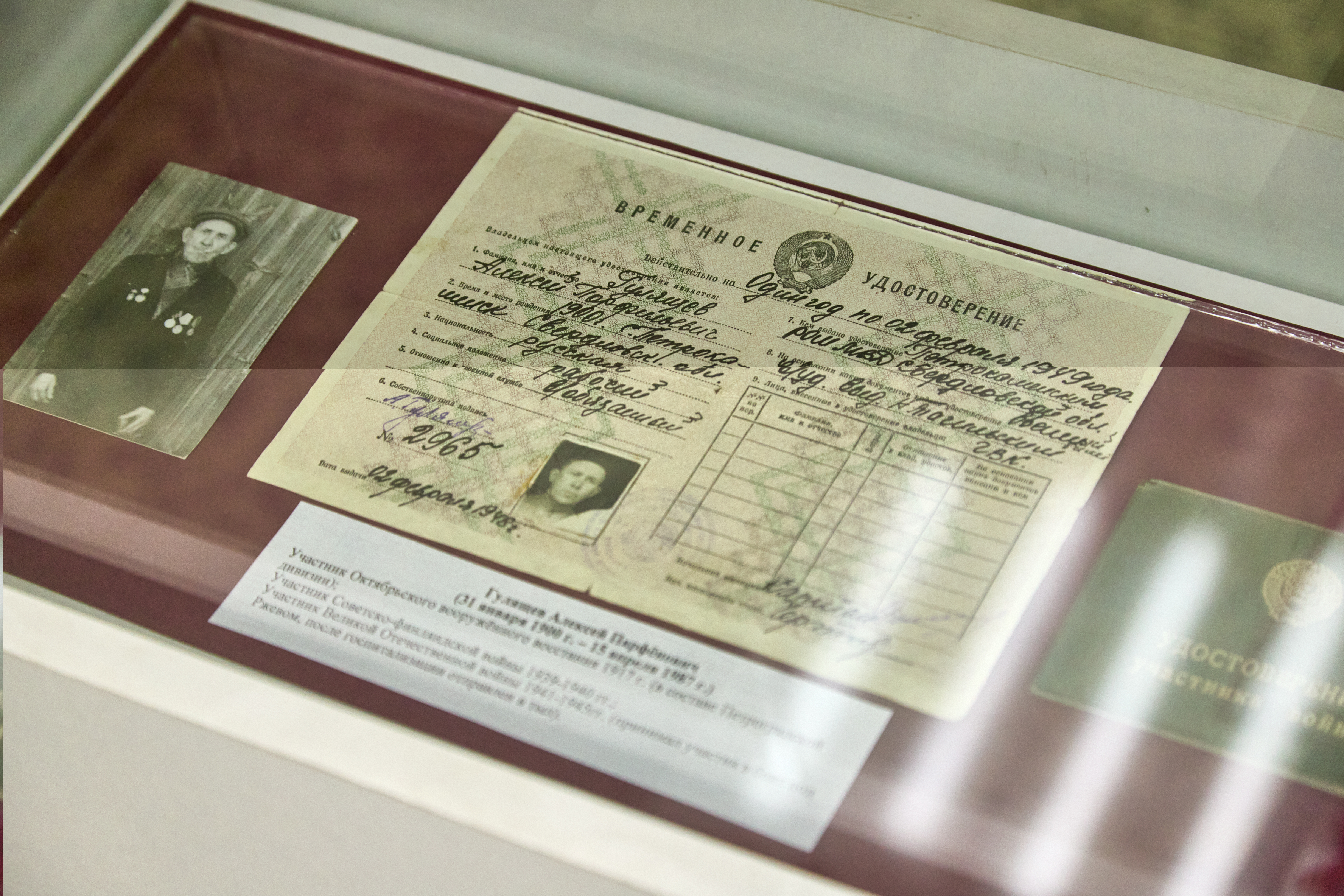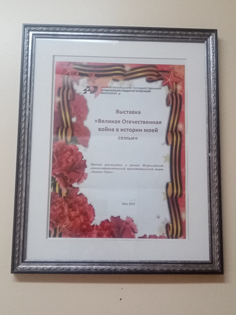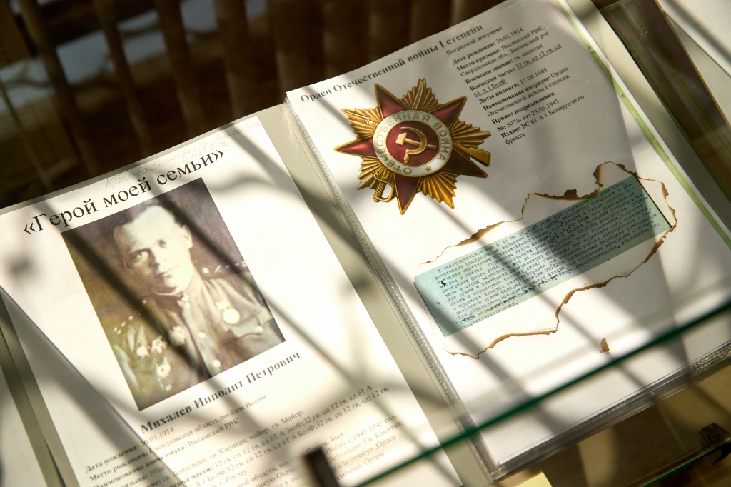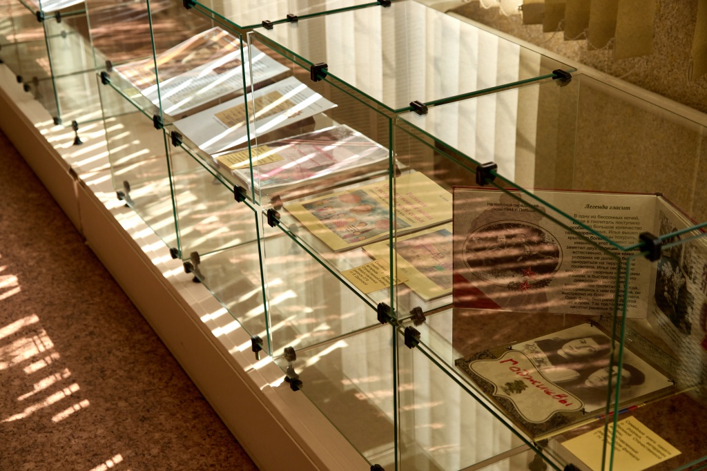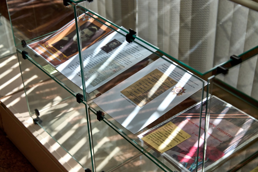 Интересны семейные книги памяти, предоставленные директором филиала Т. Н. Райхерт и деканом СГФ И. В. Даренской. В центральной вертикальной витрине – документы из семейных архивов студентов вуза, которые экспонировались на выставке «Герои моей семьи» (9 декабря 2022). В двух горизонтальных витринах – анонс нового имерсивного проекта «Великая Отечественная война в истории моей семьи», в котором 50 студентов с четырех факультетов (СГФ, ФСБЖ, ФППО, ФЕМИ), педагоги и сотрудники вуза (А. В. Овчинникова, С. В. Пичурина) представили материалы о своих семейных героях Великой Отечественной войны.