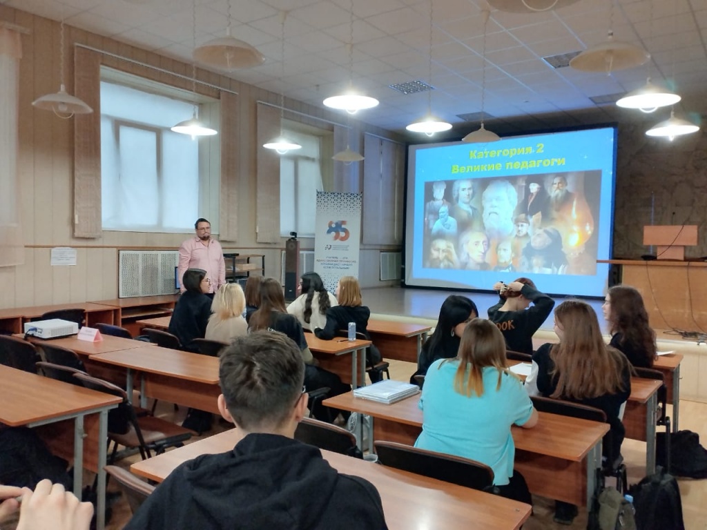 4 декабря в читальном зале института была опробована версия игры для учащихся педагогического лицея. Ее разработчик – Дмитрий Владимирович Шморгунов, главный специалист отдела воспитательной работы и молодежной политики. Все вопросы игры носили педагогическую направленность. В ходе мероприятия ребята вспомнили великих педагогов и общественных деятелей Я. Корчака, Я. А. Каменского, А. С. Макаренко; известных художников Ф. П. Решетникова, В. Маковского, Б. Кустодиева, многое другое. Пять команд учащихся педагогических классов с интересом и энтузиазмом сражались в игре. Максимальные 300 баллов удалось заработать команде «29 раков», на втором месте оказалась команда «Михалыч» с 260 баллами, и на третьем месте оказалась команда «52» со 100 баллами. Бурные аплодисменты украсили общий финал встречи.