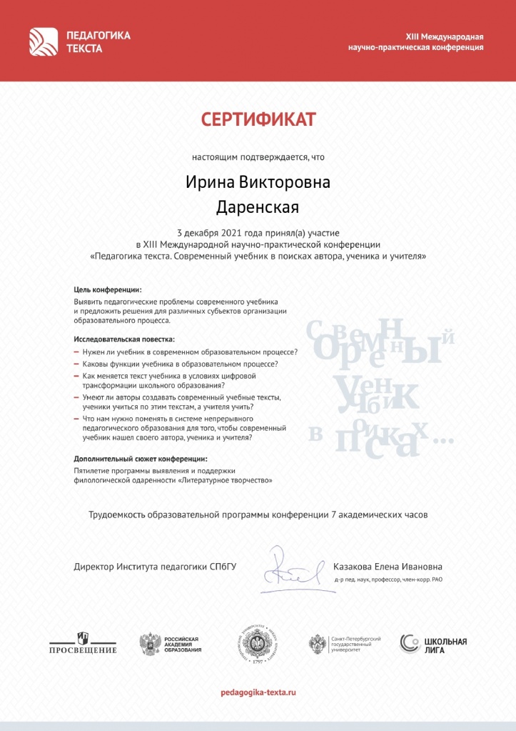 Конференция с таким названием состоялась 3 декабря 2021 г. в Санкт-Петербурге. Организаторы – СПбГУ, образовательный центр «Сириус» и группа компаний «Просвещение» – так сформулировали цель конференции: выявить педагогические проблемы современного учебника и предложить решения для различных субъектов организации образовательного процесса.