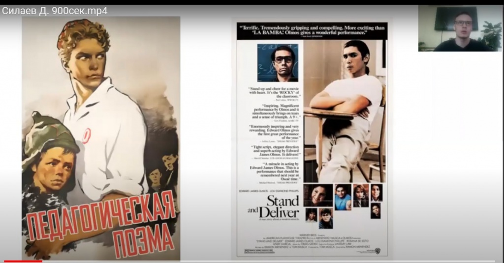 Студенты социально-гуманитарного факультета под руководством канд. ист. наук А. М. Олешковой продолжают анализировать педагогические ситуации на материалах мирового и отечественного кинематографа. В этот раз студент 5 курса Дмитрий Силаев сравнит две киноленты: «Педагогическая поэма» (1955, СССР) и «Выстоять и добиться» (1988, США).
