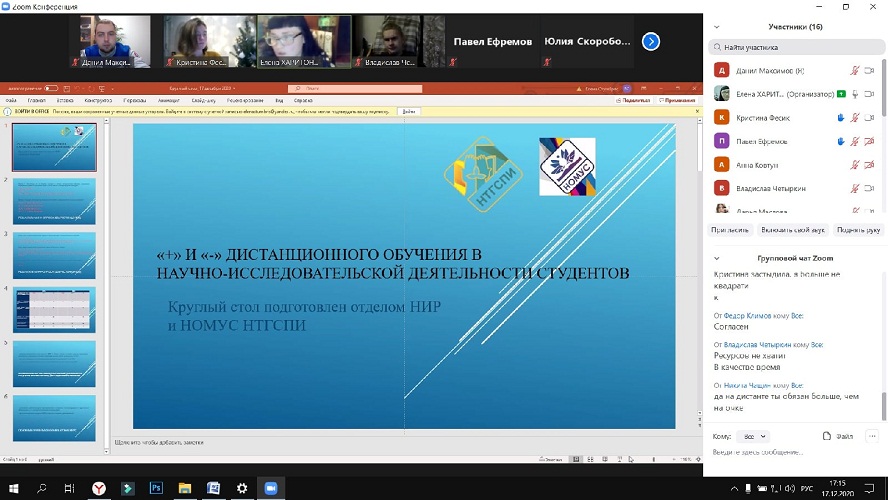17 декабря отдел научно-исследовательской работы НТГСПИ провел круглый стол «Плюсы и минусы дистанционного обучения в научно-исследовательской деятельности студентов», модераторами которого выступили начальник отдела НИР Е. Г. Харитонова и председатель НОМУС НТГСПИ Ксения Шарамок.