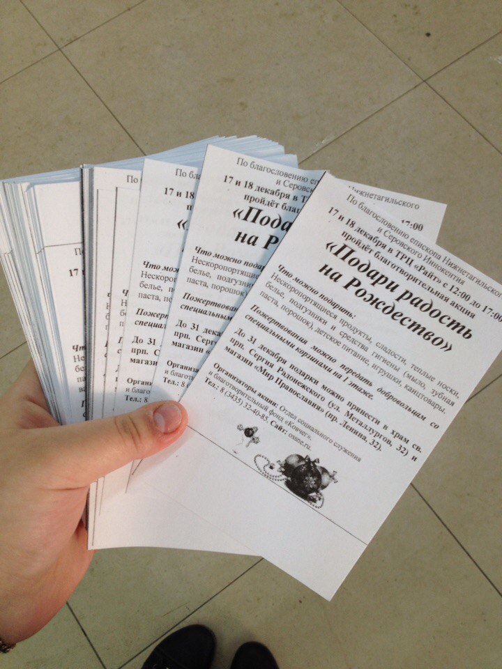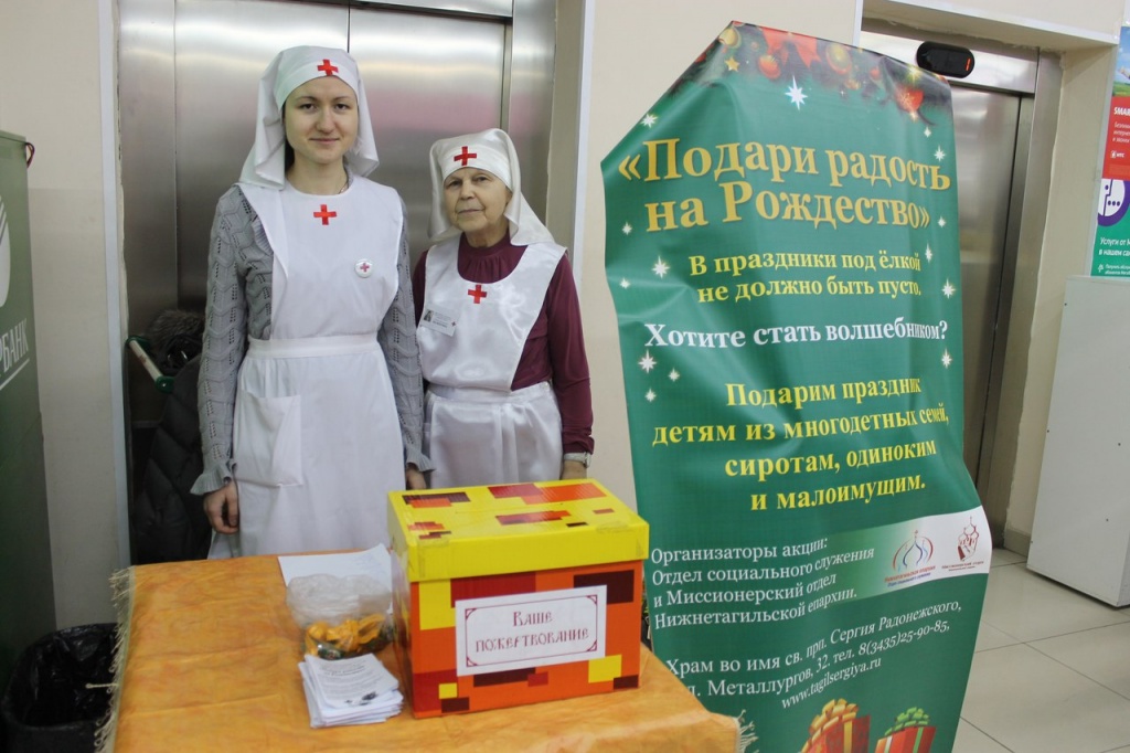 17 и 18 декабря в ТРЦ «Райт» прошла благотворительная акция «Подари радость на Рождество». Всех посетителей торгового центра, пришедших за покупками в эти дни с 12:00 до 17:00, встречали волонтеры Добровольческого центра «От сердца к сердцу» филиала РГППУ в городе Нижнем Тагиле, добровольцы центра «Милосердие» и сестры милосердия Сестричества во имя св. Луки.
