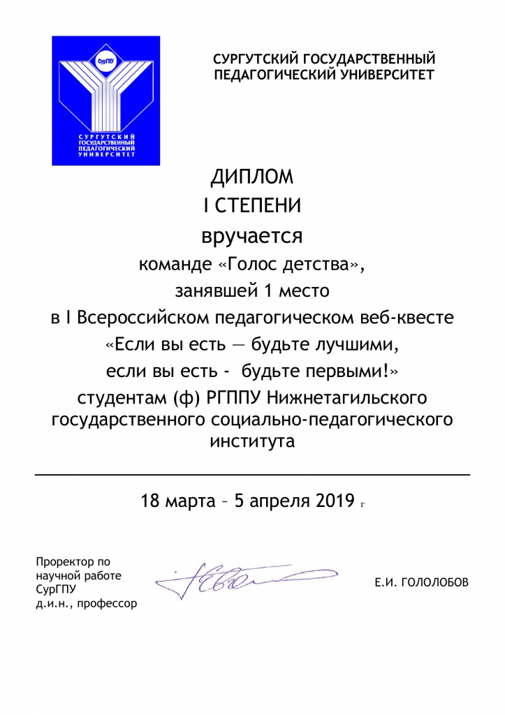 Команда студентов 4 курса ФППО «Голос детства» заняла 1 место во Всероссийском педагогическом веб-квесте, который был организован БУ ВО ХМАО-ЮГРЫ «Сургутский государственный педагогический университет» и проходил дистанционно с 18 марта по 5 апреля.