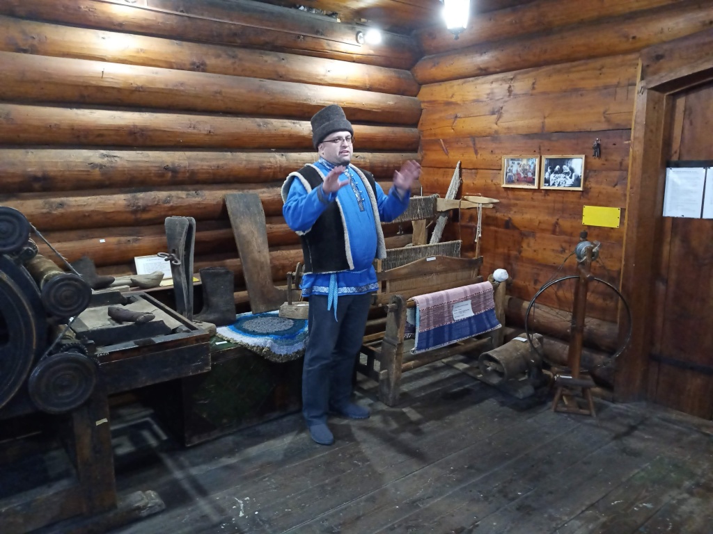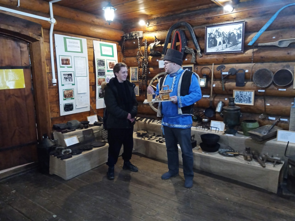 Началась экскурсия с посещения двух амбаров, где расположены интересные экспозиции. Одна посвящена промыслам Висима, в частности, старательскому делу; а вторая позволяет познакомиться с фауной региона. Надо отдать должное профессиональному мастерству экскурсоводов, которые с удовольствием и увлеченно рассказывают о быте, ремеслах, обычаях жителей Висима, начиная с 18 века. Больше всего студенты оценили интерактивную часть программы, когда сотрудники к рассказу подключали самих ребят и позволяли примерить на себя особенности жизни висимчан. В финальной части этой программы экскурсовод справедливо обратила внимание присутствующих на то, что надо ценить собственные традиции, обычаи, праздники, а не копировать западные традиции и ценности.