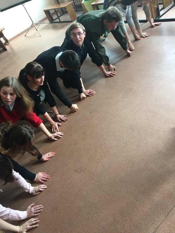 Вторым этапом была проверка ребят на их сплоченность и дружбу. Вся команда должна была принять упор лежа, и первый член команды змейкой перебраться в конец колонны. Конкурс заканчивался тогда, когда первый вставал на свое место. В конце команды получали цветную бумагу.