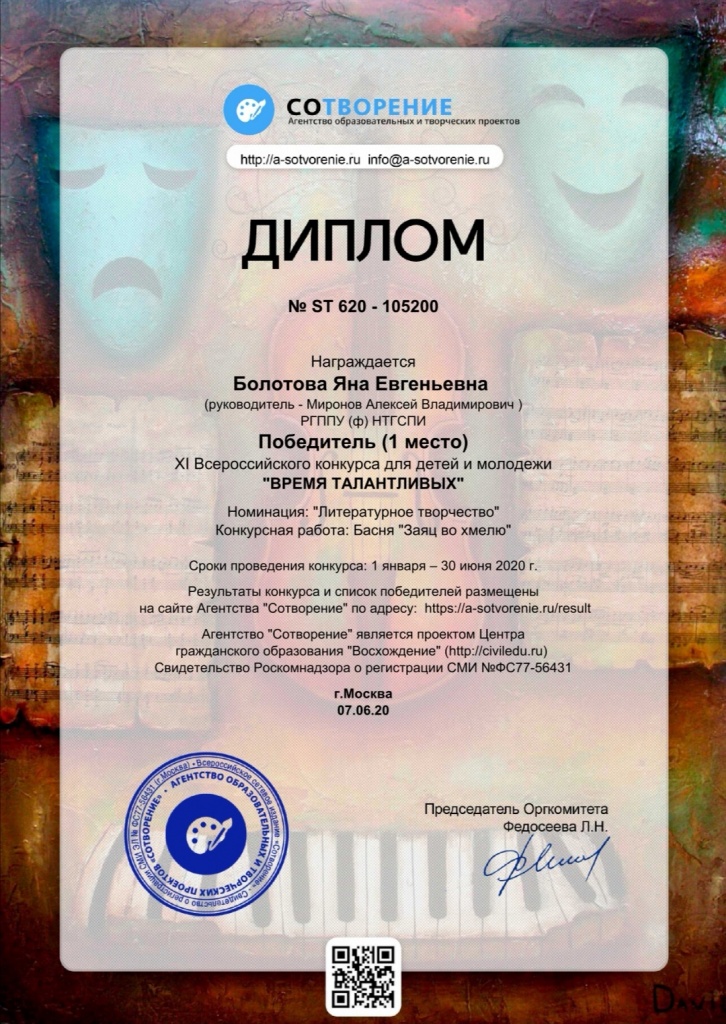Яна заняла 1-е место на XI Всероссийском конкурсе для детей и молодежи «Время талантливых» (в чтецкой номинации «Литературное творчество»), организованном Агентством образовательных и творческих проектов «Сотворение».