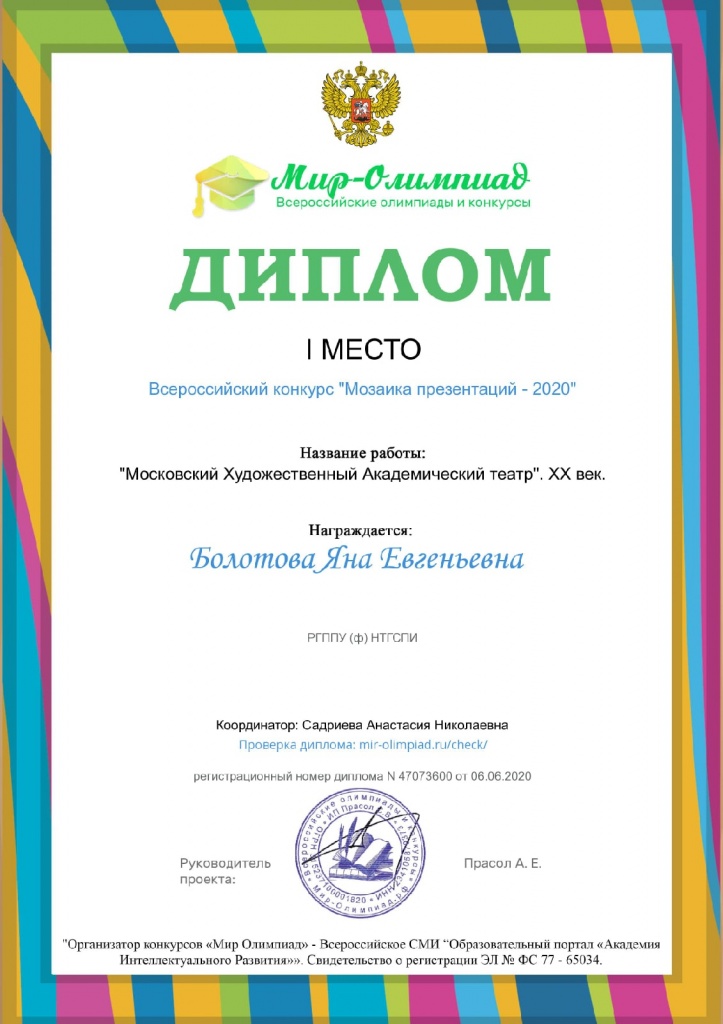 На Всероссийской олимпиаде «Мозаика презентаций – 2020» работа Яны Болотовой «Московский Художественный Академический театр. ХХ век» заняла 1-е место.