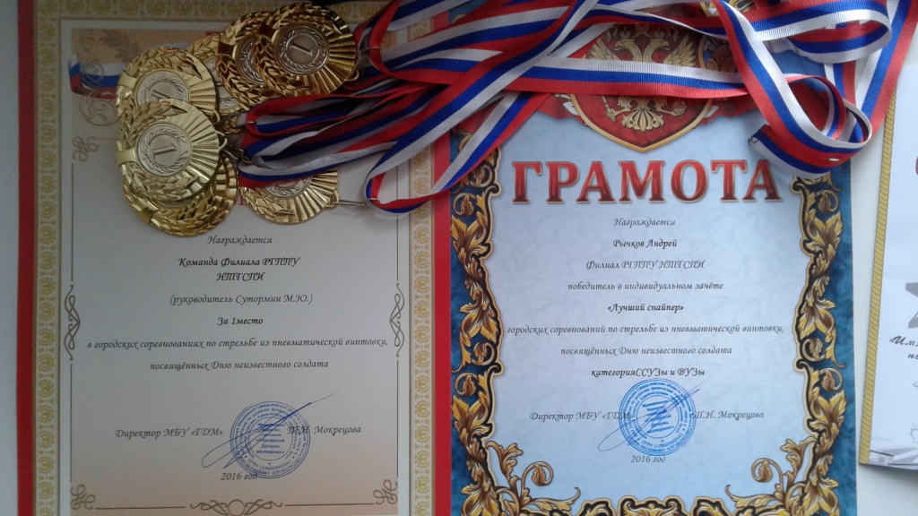 Соревнования проводились с 28–30 ноября на базе МАУ ДО «Специализированная детско-юношеская школа олимпийского резерва «Юпитер». В мероприятии приняли участие военно-патриотические клубы, военно-спортивные клубы, кадетские классы, общеобразовательные школы, ссузы и вузы города Нижний Тагил. Наша команда в составе: Пустоваловой Оксаны (СГФ, 4 курс), Щекалева Андрея (ФФМК, 1 курс), Фоминой Яны (СГФ, 3 курс), Фардиева Александра (ФСБЖ, 2 курс), Рычкова Андрея (ФСБЖ, 3 курс), Мамедовой Эсмиры (СГФ, 2 курс), Брух Екатерины (ФСБЖ, 2 курс), Лохиной Юлии (СГФ, 1 курс) заслуженно завоевала первое место! Кроме общей победы, стоит отметить награду в индивидуальном зачёте «Лучший снайпер», Рычкова Андрея, который обошел 257 участников соревнований!
