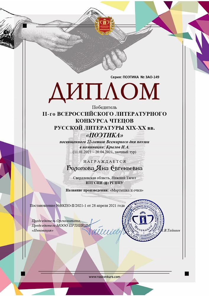 Яна стала лауреатом 1 степени V Международного конкурса «Таланты России» в номинации «Актерское мастерство», а также победителем II Всероссийского литературного конкурса чтецов «Поэтика», посвященного Всемирному дню поэзии.