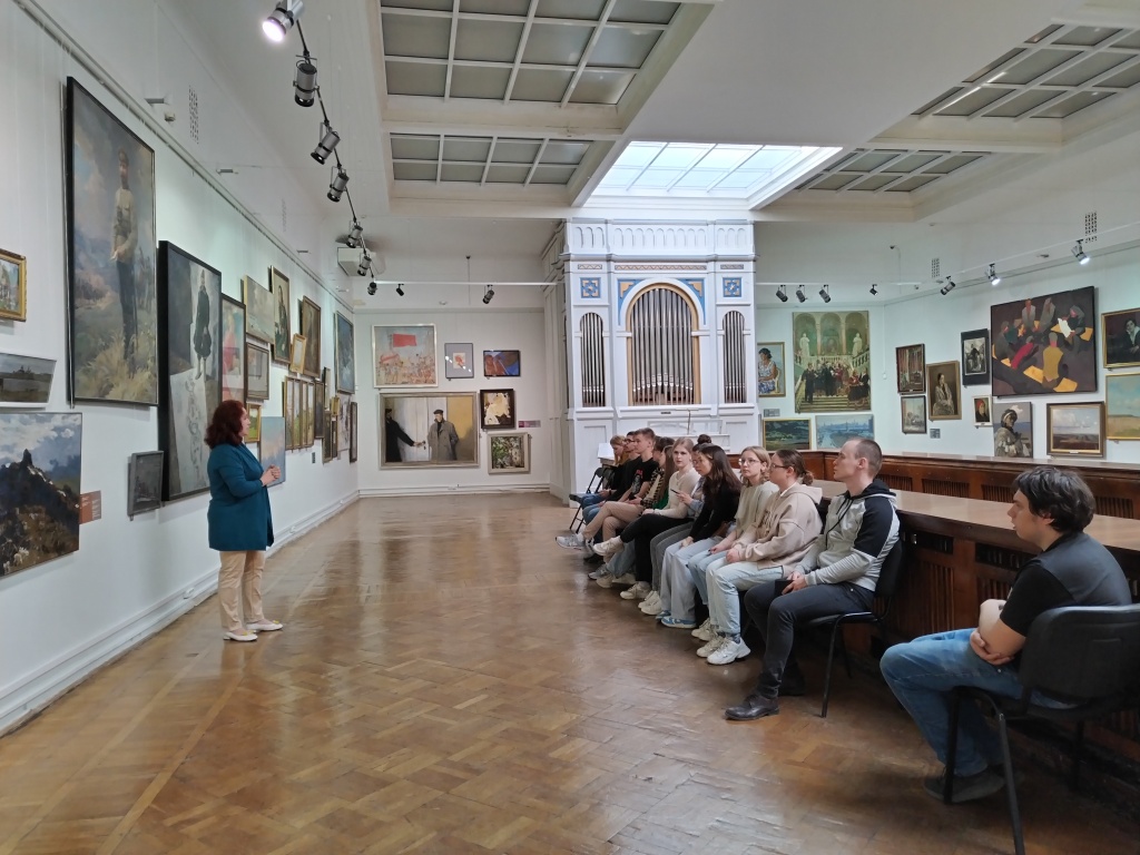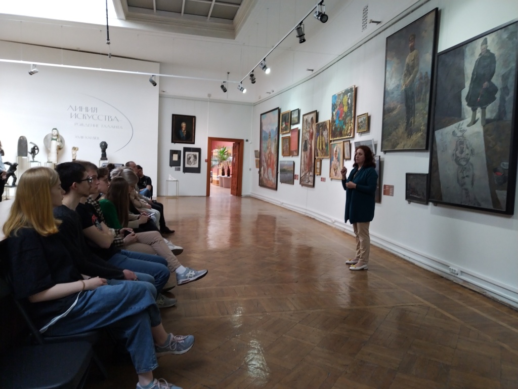 На занятие по дисциплине «Основы экскурсионного дела» ребята переместились в Нижнетагильский музей изобразительных искусств, где для них Н. А. Гундырева, заместитель директора музея по НР, провела мастер-класс «Музейная выставка: опыт проектирования и экскурсионного продвижения» в пространстве выставки «Линия искусства – рождение таланта».
