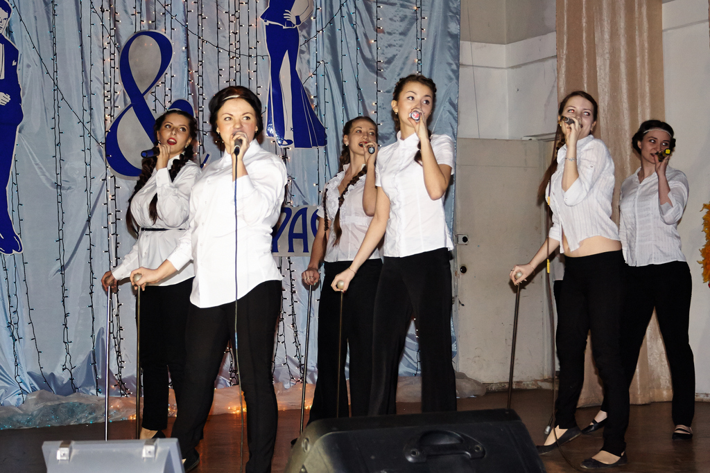 Для всех мужчин и женщин вуза со сцены звучали популярные песни из фильмов, которые исполнили вокальная студия «Sunrise», штаб студенческих отрядов и факультет сценических искусств.