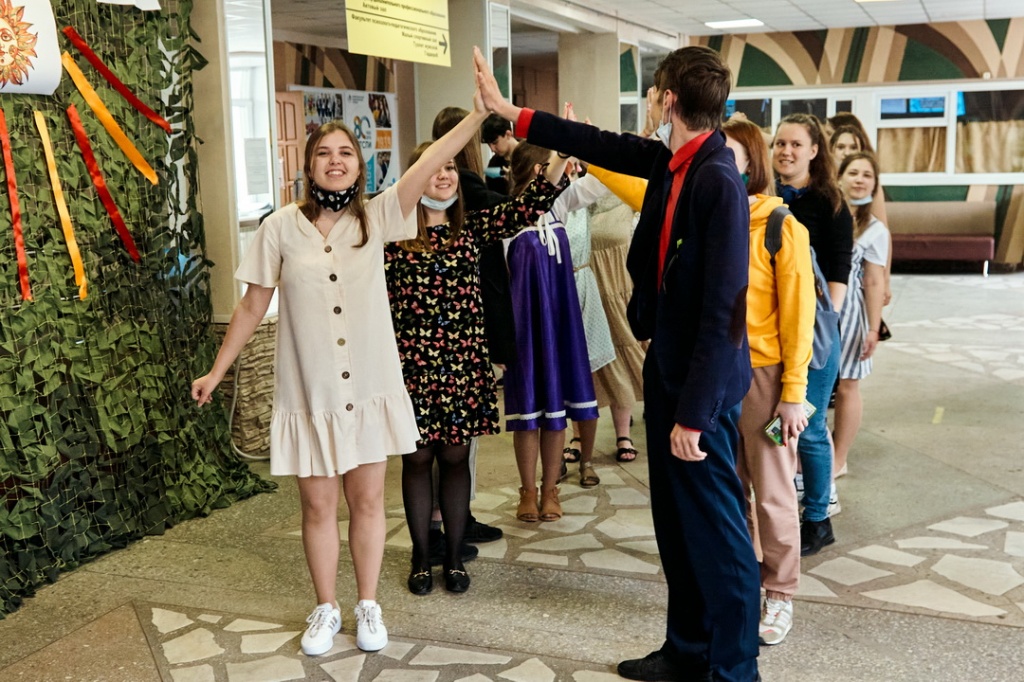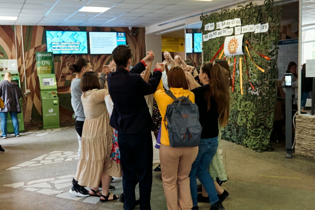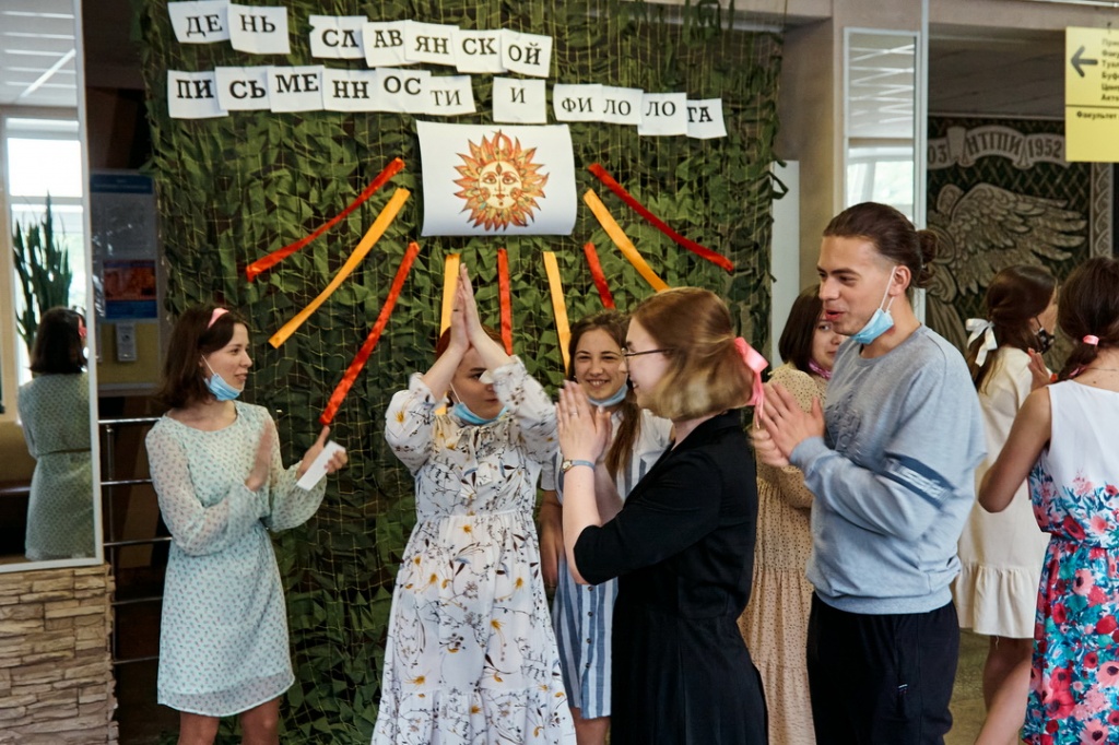 Поэтому через неделю после Дня славянской письменности и Дня филолога, утром в понедельник 31 мая, в фойе института взошло Ярило-солнце, а студентов встречали девчата с косами, в которые были вплетены цветные ленты, в сарафанах, с чаем и баранками. Всем желающим было предложено пройти веселые конкурсы: назвать детали внутреннего и внешнего убранства избы, одеть юношу и девушку в традиционные славянские костюмы, объяснить значение слов «глагол», «сыр», «або», «зелье», попробовать перечислить буквы славянского алфавита и написать свое имя на старославянском языке. Студенты других профилей и курсов ФФМК приняли участие в викторине, посвященной возникновению и развитию книжной культуры на Руси. Все участники получили сладкие призы – заслуженные или утешительные.