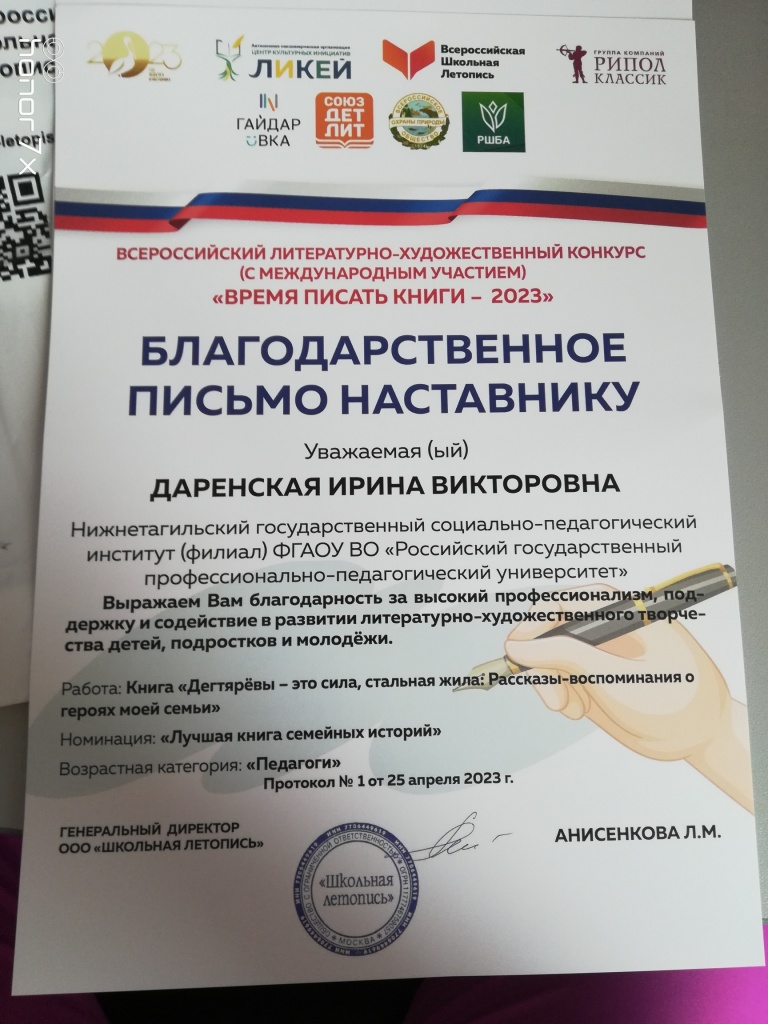 Победителем Всероссийского конкурса в номинации «Лучшая книга семейных историй» в категории «Педагоги» стала декан социально-гуманитарного факультета филиала РГППУ в г. Н. Тагиле Ирина Викторовна Даренская, которая представляла на конкурс литературно-художественный опыт проведения исследования своего рода.