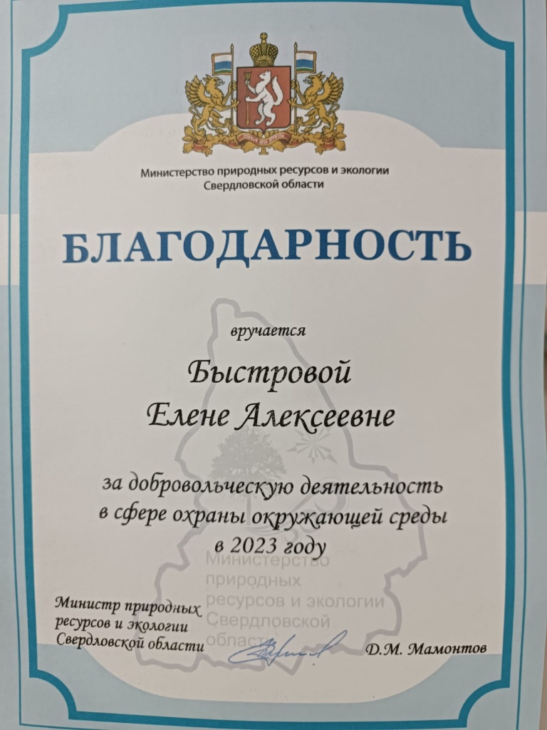 За успешную реализацию проектов в сфере развития экологического добровольчества в 2023 году министерством природных ресурсов и экологии Свердловской области отмечены декан социально-гуманитарного факультета филиала РГППУ в г. Нижнем Тагиле Ирина Викторовна Даренская и старший преподаватель факультета спорта и безопасности жизнедеятельности Елена Алексеевна Быстрова.