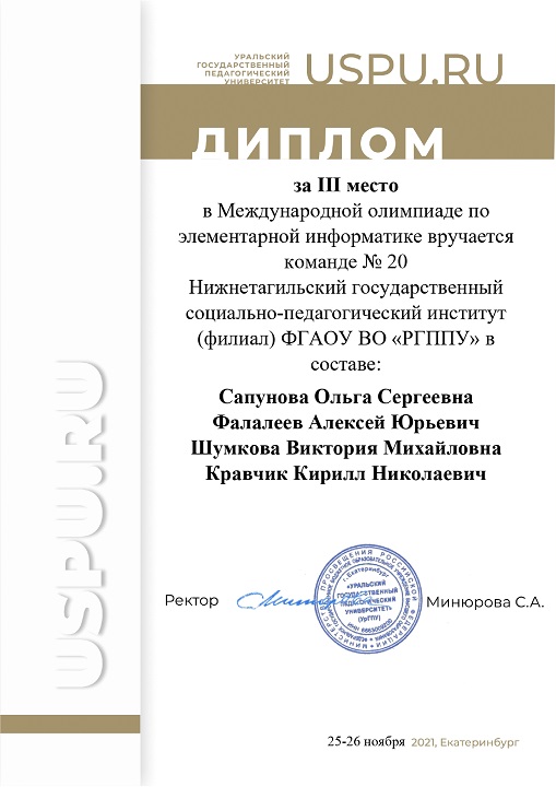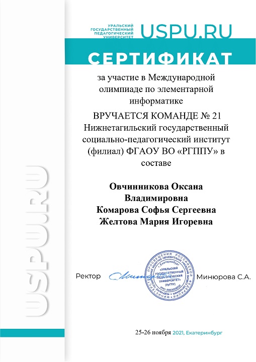 26 ноября на базе ФГБОУ ВО «Уральский государственный педагогический университет» в дистанционном формате состоялась Международная олимпиада по элементарной информатике, в которой приняли участие 29 команд из России, Белоруссии, Кыргызстана и др., в том числе две команды студентов из нашего вуза.