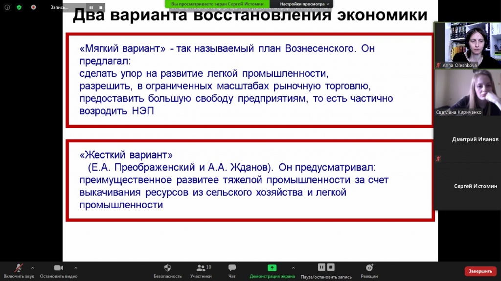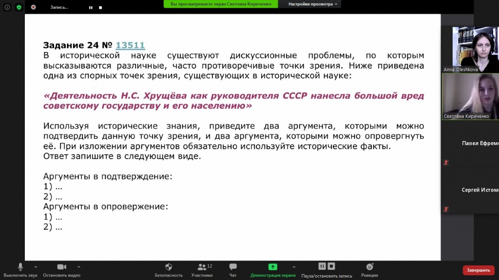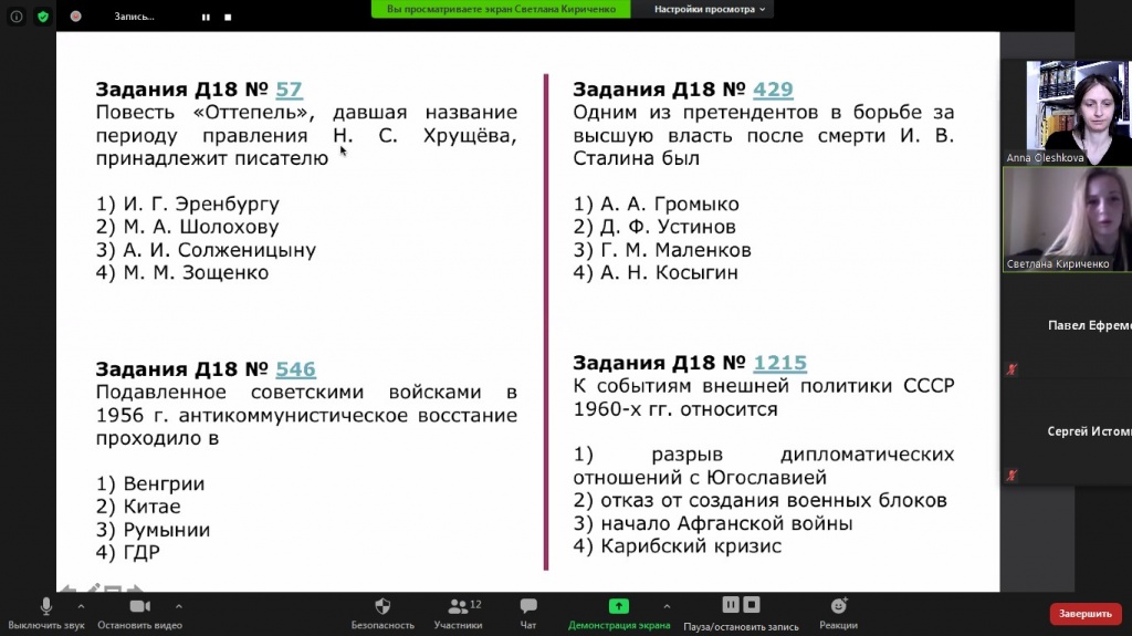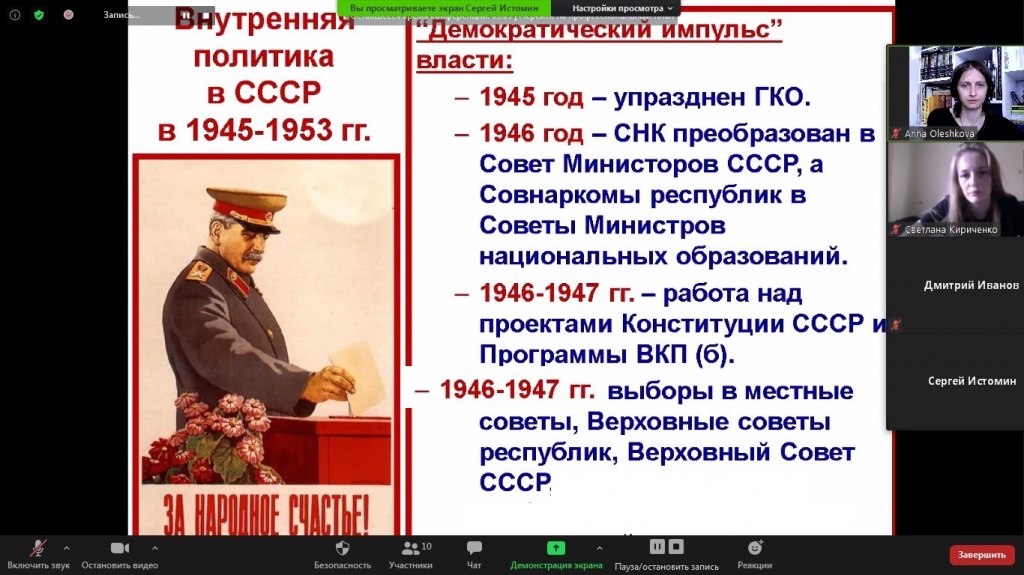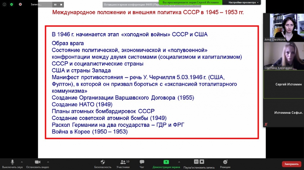 В ходе дискуссии были рассмотрены одни из самых сложных заданий по истории XX века – вопросы по историческим картам и работе с первоисточниками. Был представлен внутриполитический курс 1945–1953 гг.: обозначены варианты экономического восстановления страны, охарактеризованы изменения в ее культурной сфере. Во внешней политике раскрыты причины и сущность такого явления, как холодная война.
