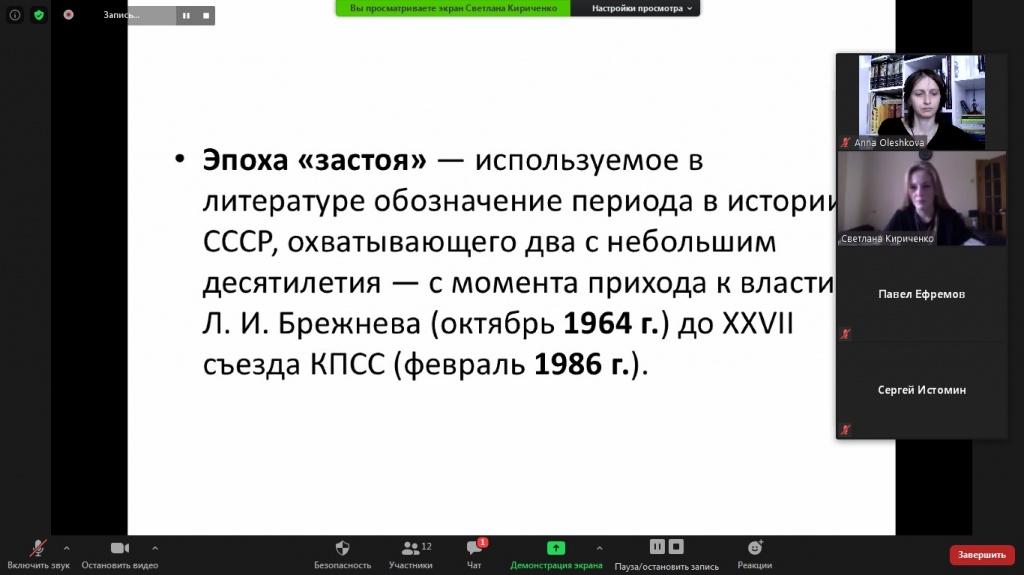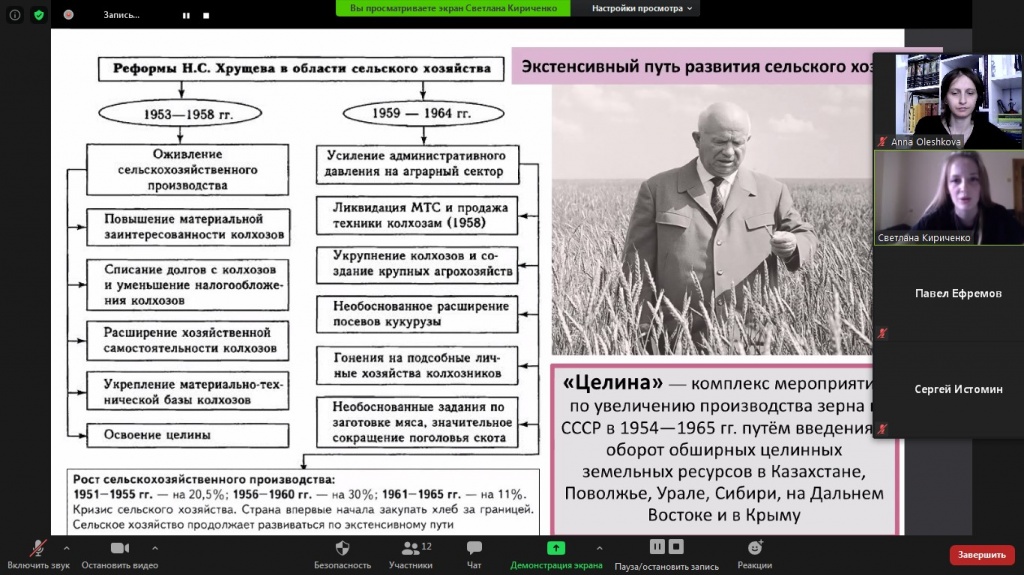 Были определены характерные черты развития СССР при Н. Хрущеве и Л. Брежневе, приведены примеры заданий из первой и второй части ЕГЭ. Докладчиками были студенты 3 курса СГФ: Дмитрий Иванов, Сергей Истомин, Светлана Кириченко и Ксения Гусакова. Модератором дискуссии выступила Анна Михайловна Олешкова, преподаватель СГФ.