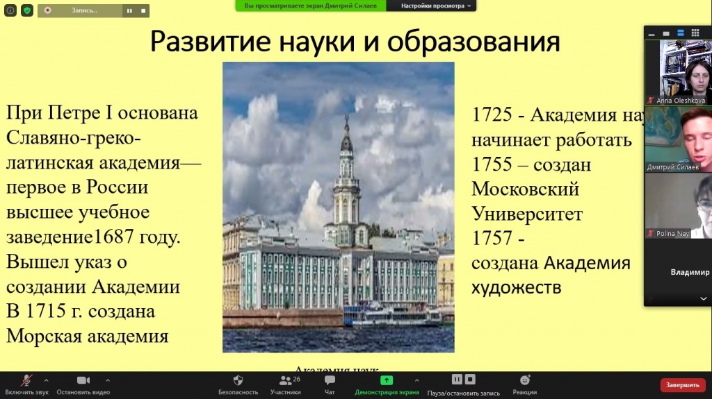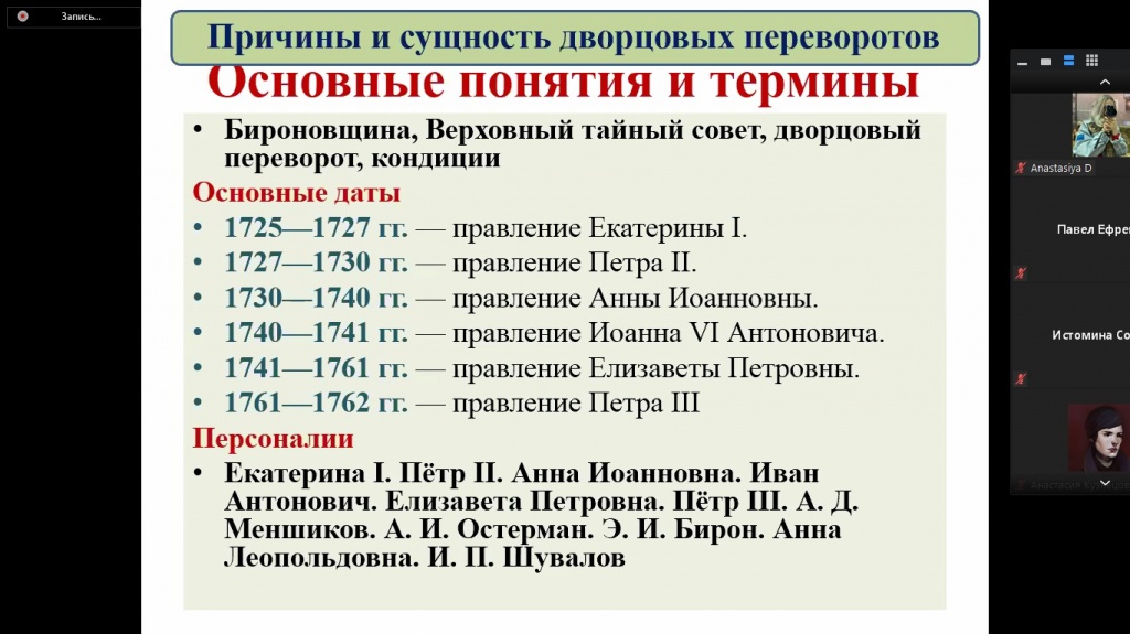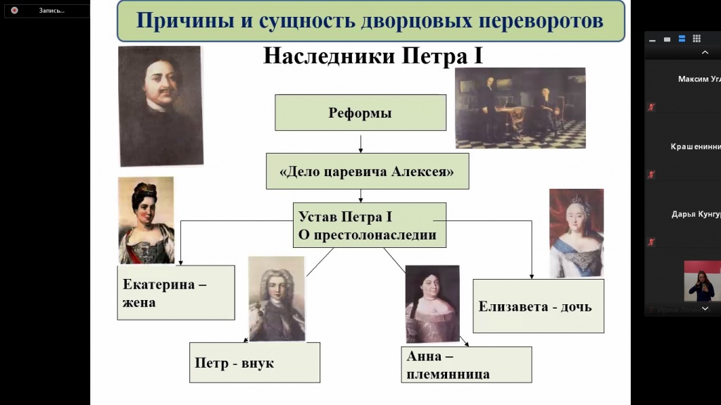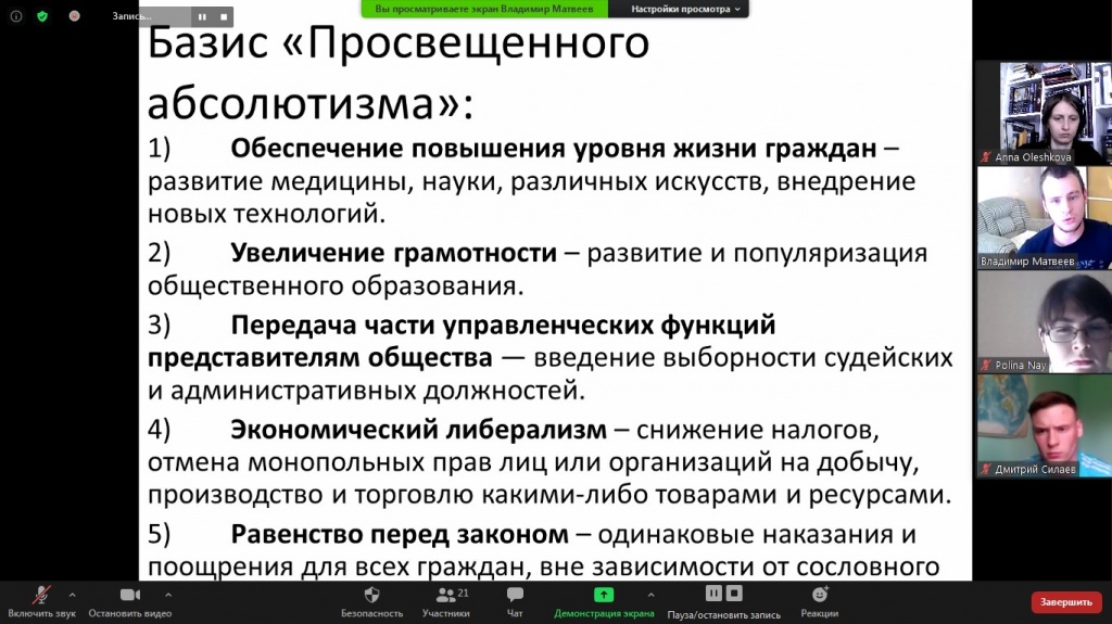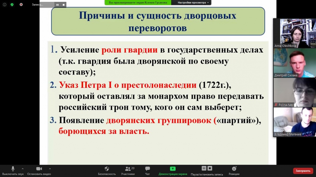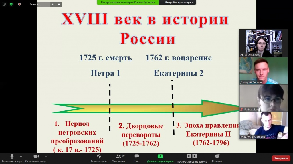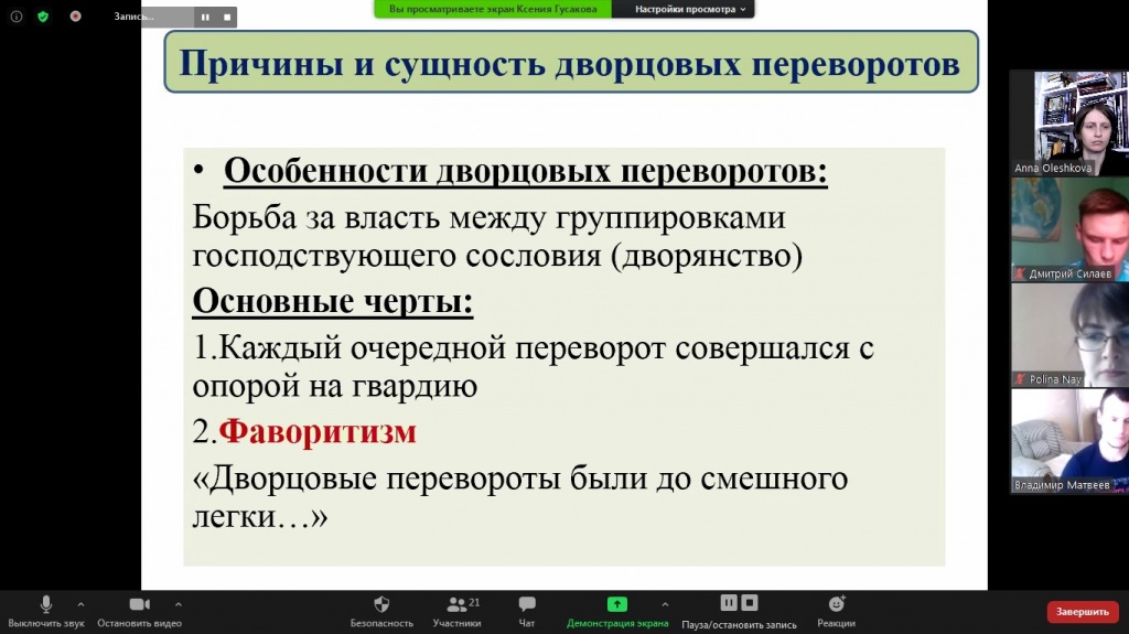 11 июня состоялось еженедельное заседание дискуссионного клуба «Pro et contra» на платформе Zoom. Темой для анализа стали Дворцовые перевороты и процессы модернизации России в XVIII–XIX вв. Основными докладчиками выступили студенты 3 курса СГФ Никита Ворошилов, Ксения Гусакова, Владимир Матвеев и Дмитрий Силаев.