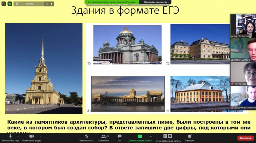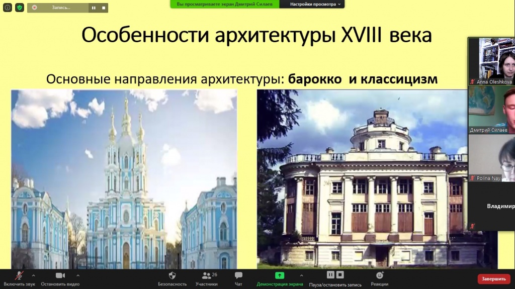 Дмитрий Силаев охарактеризовал культурные особенности эпохи Дворцовых переворотов. Докладчик подробно остановился на стилях архитектуры и живописи, обозначил тенденции развития отечественной науки. В конце данного блока были представлены задания ЕГЭ, требующие от школьников знания визуальных источников.