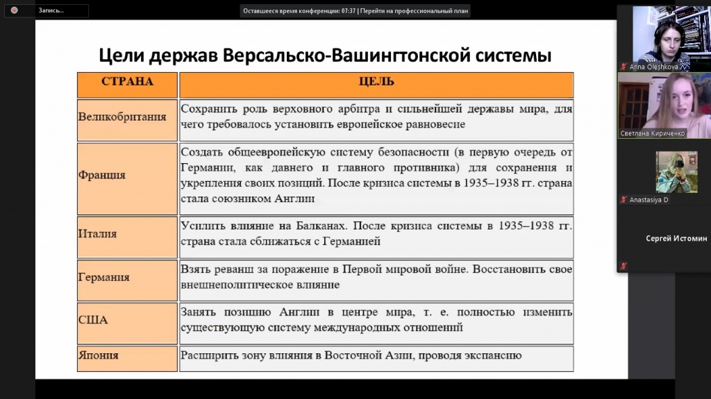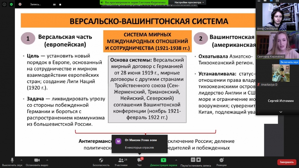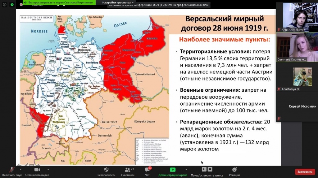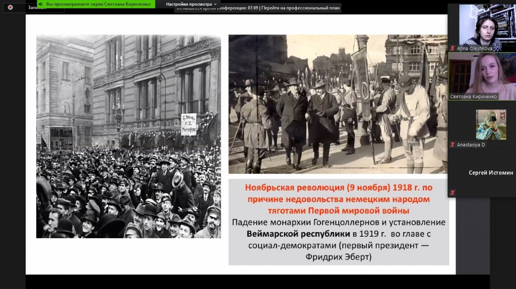 Светлана Кириченко сделала акцент на предпосылках мирового конфликта. Были рассмотрены последствия установления Версальско-Вашингтонской системы, определены особенности международных отношений после Первой мировой войны. Отдельно была представлена внутриполитическая ситуация в Германии.