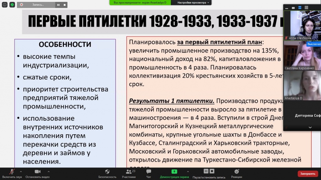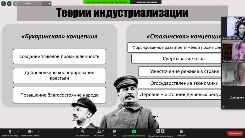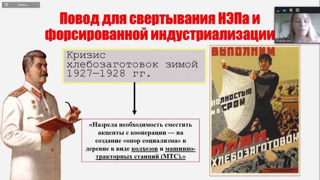 Анастасия Демина рассказала о сути преобразований и итогах сталинской модернизации. Мы ознакомились с основными концепциями развития государства и мероприятиями, проводимыми в период 30–40-х гг. XX в. Определили преимущества и недостатки НЭПа, причины отказа от данного экономического курса, проанализировали экономическую ситуацию в стране перед началом войны.