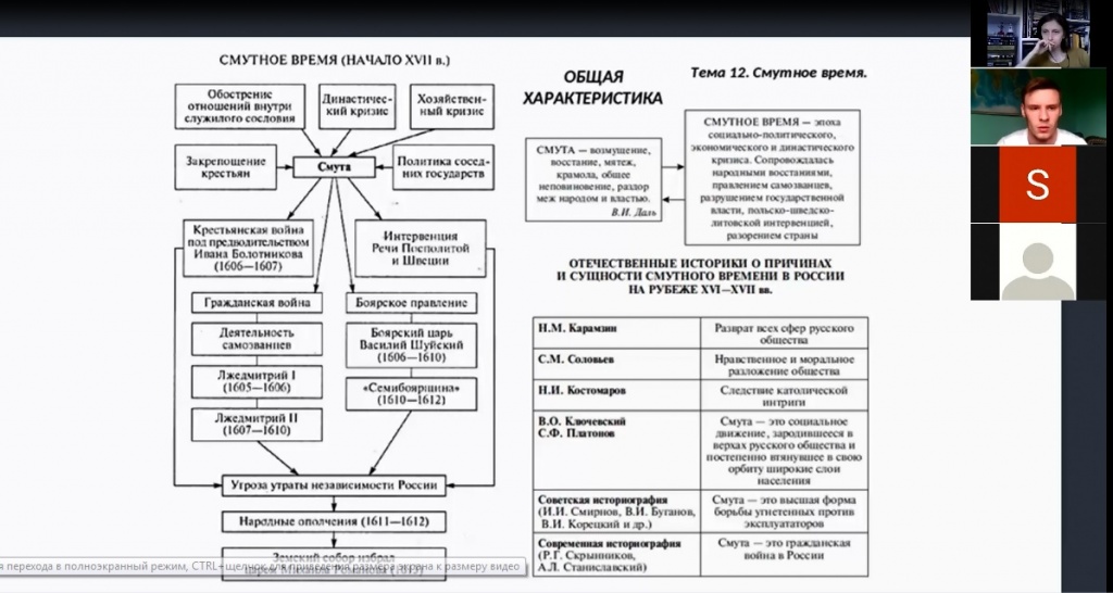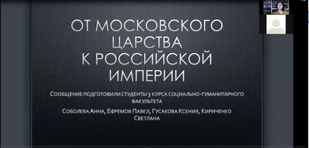Непосредственно Смуту проанализировала Ксения Гусакова, начав реконструкцию исторической действительности с правления Бориса Годунова. Отдельно были обозначены события, предшествовавшие освобождению Москвы силами второго ополчения. Также были выявлены особенности правления Михаила Федоровича Романова, первого русского царя из этой династии. Слушатели и докладчики были сосредоточены на мерах царя, способствующих восстановлению страны после тех разрушений, которые принесла Смута. Также было уделено внимание отношениям Русского государства с Речью Посполитой и Шведским королевством.