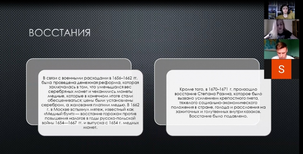 Завершил заседание клуба доклад Светланы Кириченко о правлении царя Алексея Михайловича Романова. Была ярко освещена тема внутренней политики «тишайшего царя», особый акцент сделан на анализе восстаний и бунтов, а также на специфике церковного раскола, из-за чего становится понятно, почему XVII век называется «Бунташным».