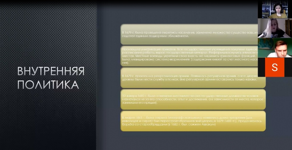 Анна Соболева продолжила рассказ, характеризуя период правления Ивана IV Грозного. Был проанализирован курс внутренней политики, акцентировано особое внимание на специфике опричнины. Поражение в Ливонской войне было раскрыто как один из ключевых факторов грядущей Смуты.