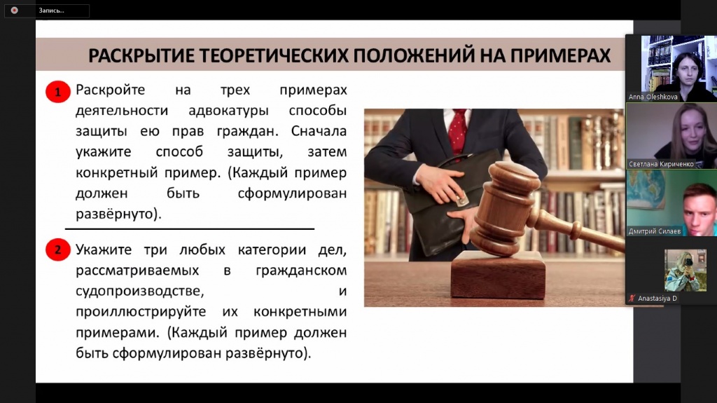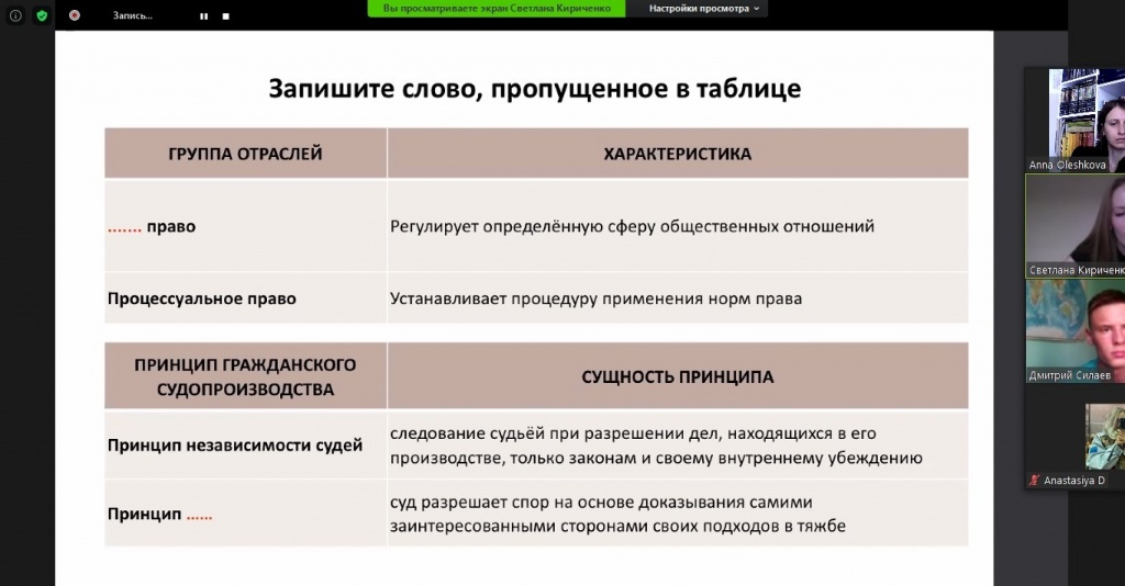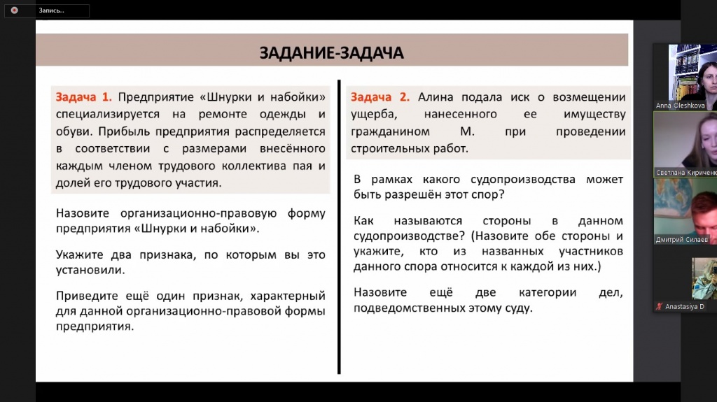 Светлана Кириченко сделала акцент на теме «Право». Ей были рассмотрены задания, связанные с основами конституционного строя РФ, имущественные и неимущественные права граждан, законодательный процесс в РФ и др. Светлана привела примеры оптимальных вариантов по составлению сложного плана по темам, представила рекомендации по решению заданий-задач.