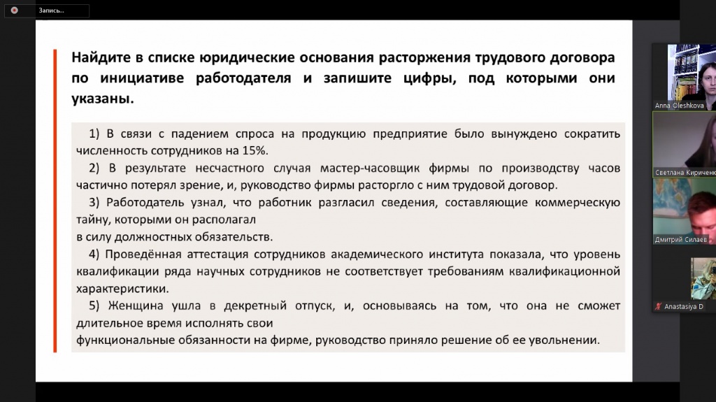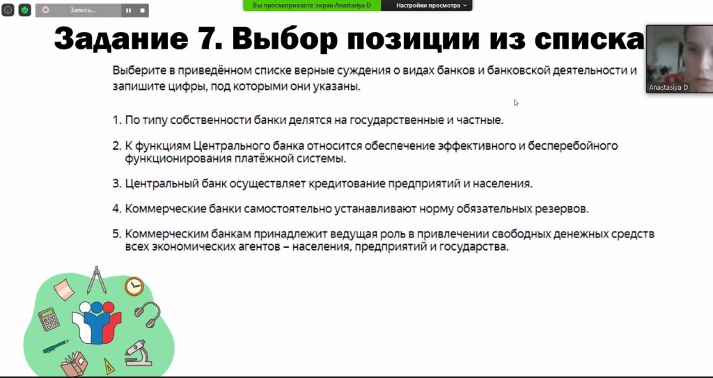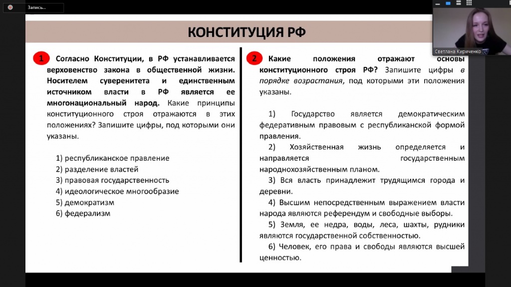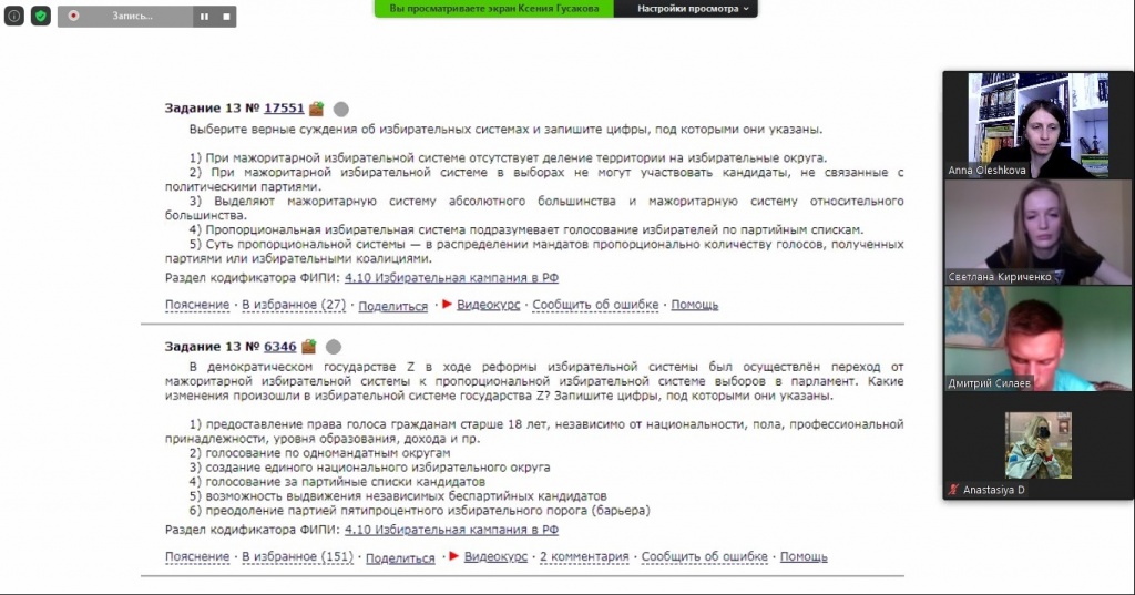 Ксения Гусакова проанализировала политологический блок, рассмотрела задания, которые могут вызвать определенные трудности на экзамене у школьников, в частности, были затронуты вопросы, связанные с определением политических режимов, форм государственно-территориального устройства и правления. Также Ксения смогла обозначить основные признаки и показать разницу между мажоритарной, пропорциональной и смешанной избирательными системами.