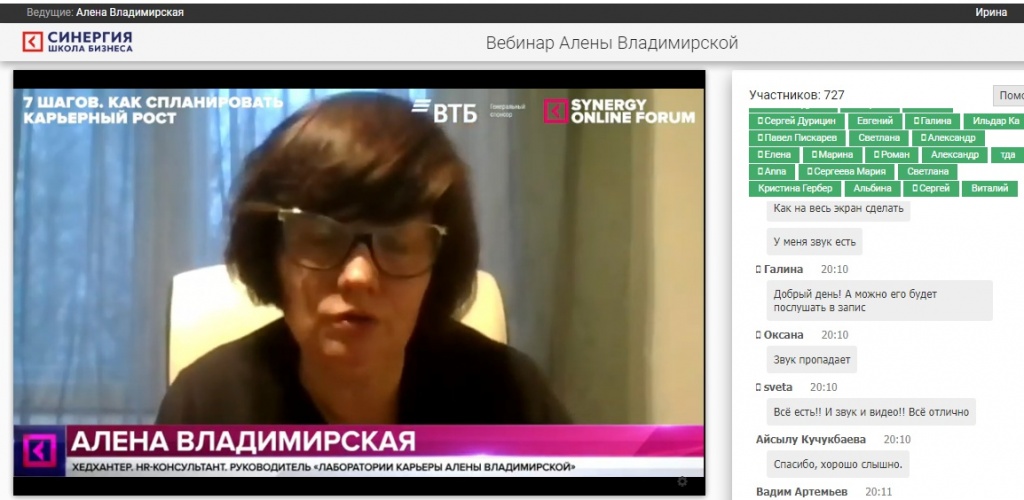 А вечер завершился вебинаром руководителя «Лаборатории карьеры» Алены Владимирской на тему «Карьерная перезагрузка. Как построить успешную карьеру», организованным Университетом «Синергия». Спикер поделилась своим видением тенденций на рынке труда, определила, что является успехом хорошей качественной карьеры.