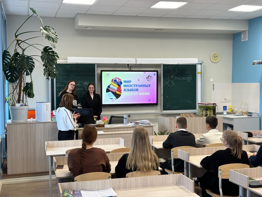 10 ноября студенты 2 курса факультета филологии и межкультурной коммуникации Дарья Нестеренко и Диана Викулова под руководством доцента кафедры Елены Рифовны Боровковой провели профориентационное мероприятие для учащихся 11-х классов МАОУ СОШ № 85 г. Нижнего Тагила. Они выступили перед школьниками, рассказали о мире профессий, о престиже и важности выбора профессии учителя для будущего нашей страны. Для школьников была представлена презентация, рассказывающая о нашем институте и факультете. Студенты провели интеллектуальную викторину «Мир иностранных языков».