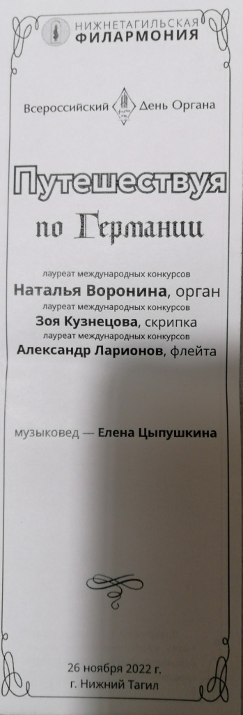 Путешествовать по Европе – это реально вместе с Нижнетагильской филармонией. В конце ноября студенты 4 курса, изучающие английский и французский языки, вместе с куратором группы З. И. Трубиной совершили виртуальное путешествие по Германии. Пушкинская карта дала возможность насладиться завораживающими звуками органа и произведениями, написанными немецкими композиторами в разные эпохи. Это прелюдии и другие сочинения И. С. Баха, И. Брамса, Д. Букстехуде.