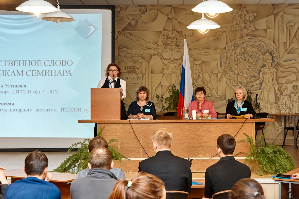 Программа семинара была очень насыщенна. Открывало семинар пленарное заседание, на котором с приветственным словом участникам выступила Светлана Александровна Устинова, кандидат юридических наук, заместитель директора НТГСПИ (ф) РГППУ. Анна Саввишна Аникина, кандидат педагогических наук, доцент кафедры социальной работы, управления и права НТГСПИ (ф) РГППУ в великолепной академической манере раскрыла концептуальные подходы к патриотическому воспитанию молодежи. Особое впечатление на участников семинара произвел фрагмент музыкально-поэтического проекта студентов отделения сценических искусств НТГСПИ (ф) РГППУ «Фронтовые осколки». Слезы стояли на глазах у всех…