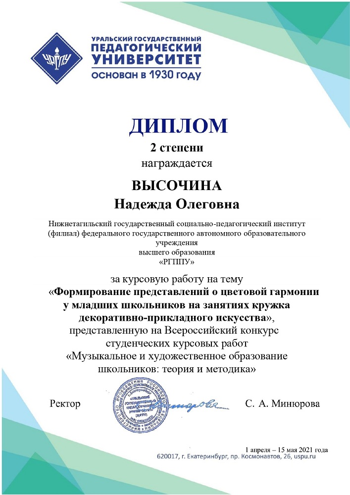 Высокую оценку заслужили курсовые работы, выполненные под руководством доцентов кафедры психологии и педагогики дошкольного и начального образования Нижнетагильского государственного социально-педагогического института (филиала) ФГАОУ ВО «Российский государственный профессионально-педагогический университет» И. Б. Ческидовой и Е. Д. рофимовой.