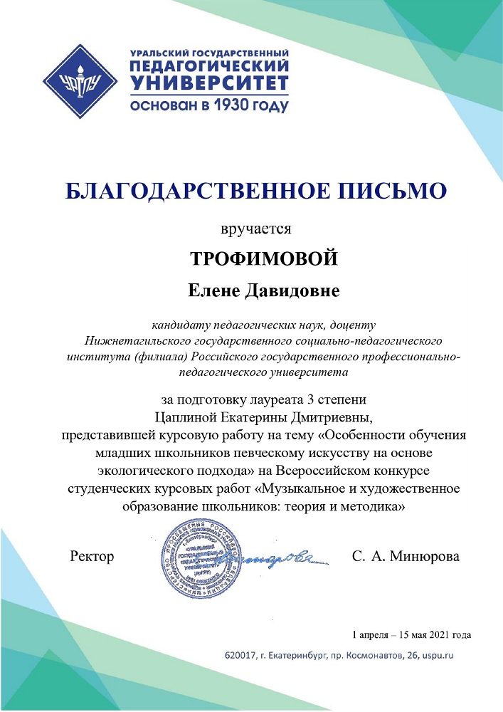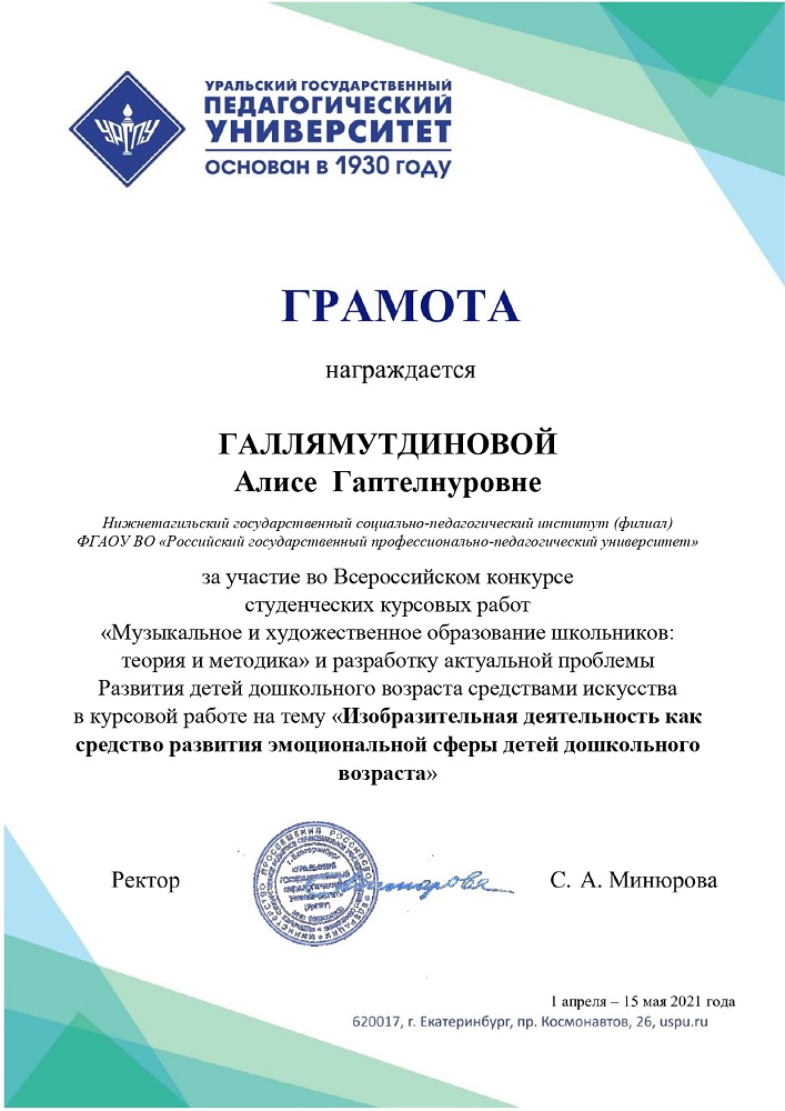 Студенты факультета психолого-педагогического образования приняли участие во Всероссийском конкурсе студенческих курсовых работ «Музыкальное и художественное образование школьников: теория и методика», который ежегодно проводится факультетом музыкального и художественного образования Уральского государственного педагогического университета (г. Екатеринбург).