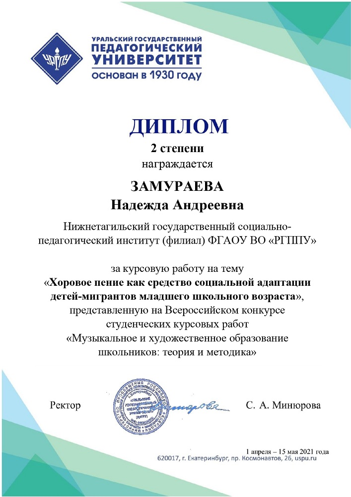 Призерами конкурса, отмеченными дипломами 2 степени, стали Надежда Замураева (курсовая работа по теме «Хоровое пение как средство социальной адаптации детей-мигрантов младшего школьного возраста», научный руководитель – канд. пед. наук, доцент Е. Д. Трофимова) и Надежда Высочина (курсовая работа по теме «Формирование представлений о цветовой гармонии у младших школьников на занятиях кружка декоративно-прикладного искусства», научный руководитель: канд. пед. наук, доцент И. Б. Ческидова).