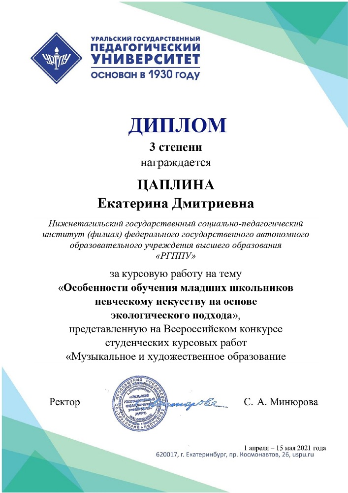Дипломом 3 степени награждена Екатерина Цаплина, выполнившая курсовую работу по теме «Особенности обучения младших школьников певческому искусству на основе экологического подхода» (научный руководитель – канд. пед. наук, доцент Е. Д. Трофимова).