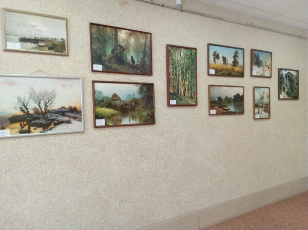 На выставке представлены репродукции 23 картин известных русских художников 19 века: И. И. Шишкина, И. И. Левитана, Ю. Ю. Клевера, А. К. Саврасова и др.