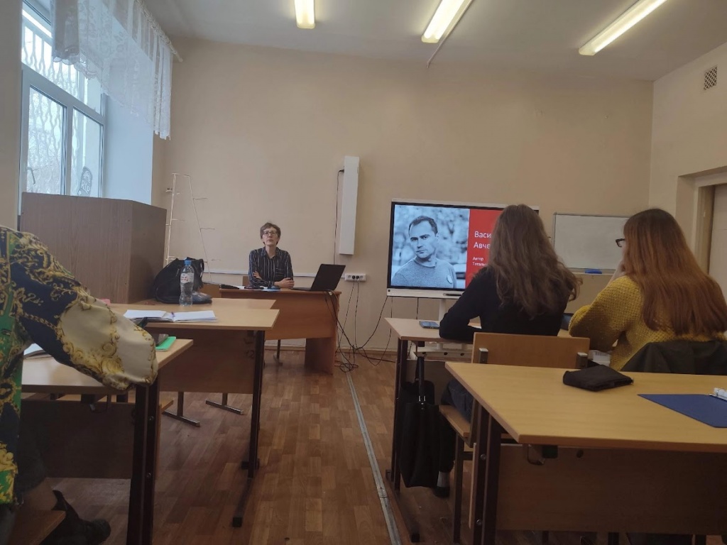 В качестве текста для диктанта был предложен фрагмент из произведения Василия Авченко, который позволил присутствующим на занятии познакомиться со стилем этого автора. Г. А. Авдеева обратилась к аудитории с вопросом, ощущают ли студенты некую аллюзию или цитату в первом абзаце фрагмента: «… восточная же периферия корчится безъязыкая». Нашлись знатоки творчества В. Маяковского, которые увидели отсылку к поэме «Облака в штанах».