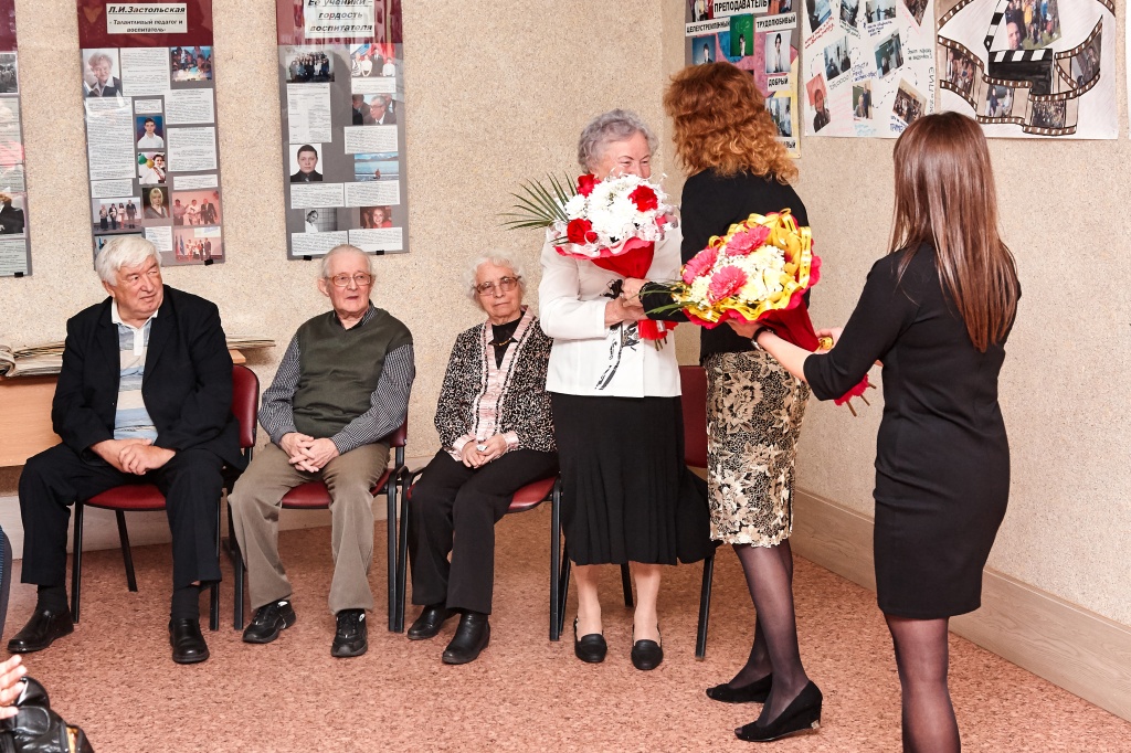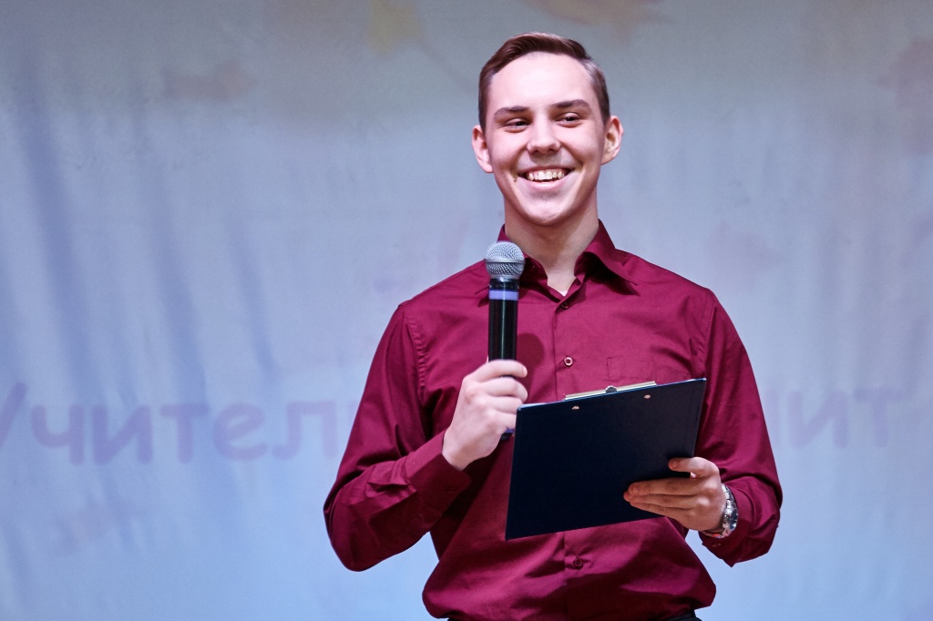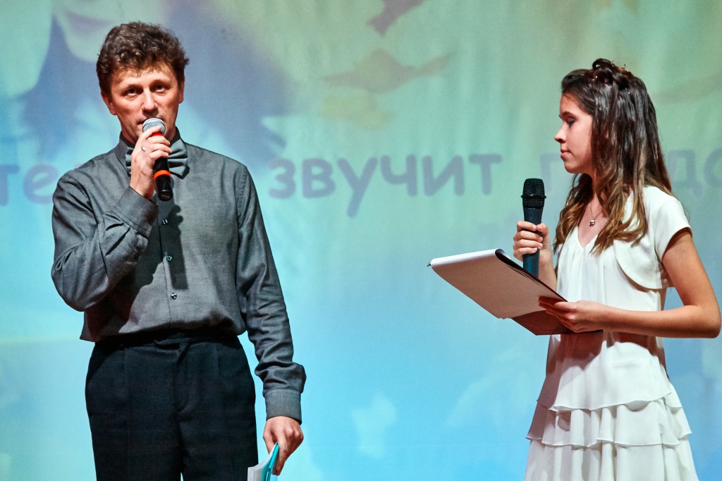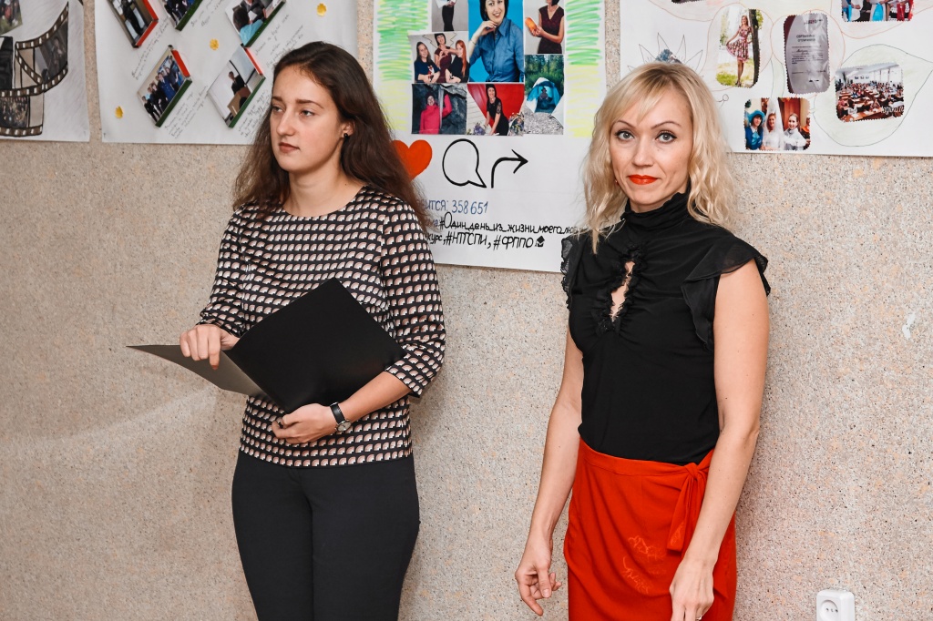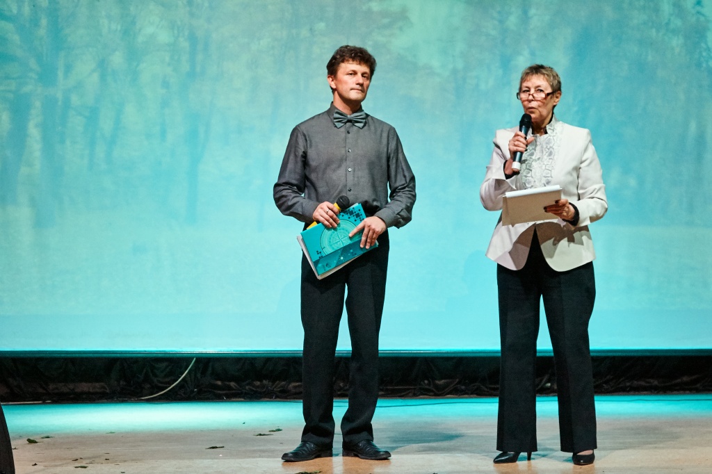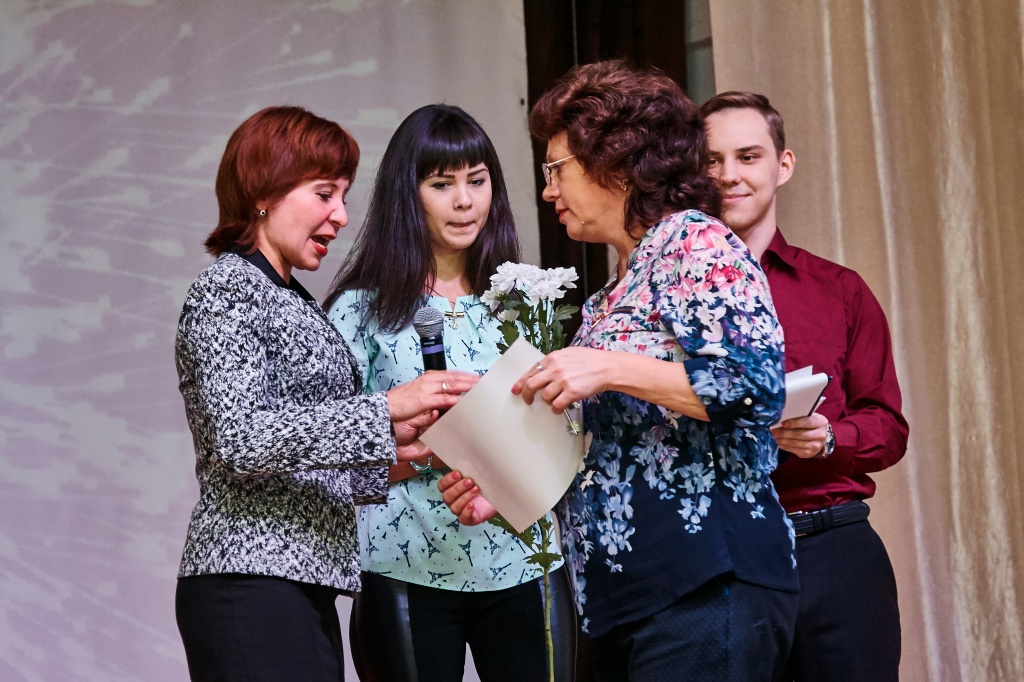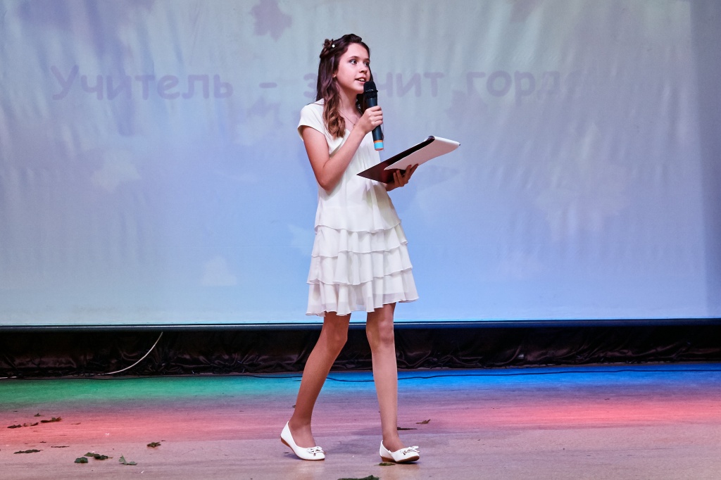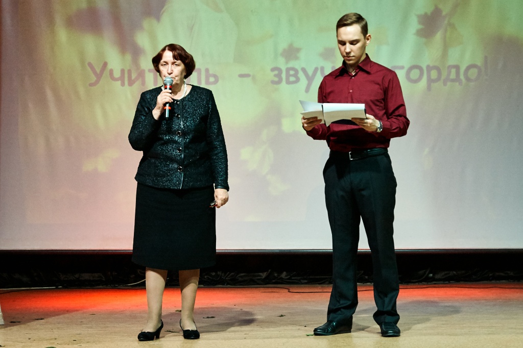 Ведущими праздничного концерта стали три героини: Татьяна Кливцевич, Алена Неустроева – выпускница ФЕМИ 2016 года, а ныне учитель математики школы № 64, Лариса Митрофановна Чехута – Заслуженная артистка РФ, доцент кафедры ТХО. Они вдохновенно сыграли историю одного человека – учителя. Ведущие представили историю маленькой девочки, которая только мечтает быть учителем, потом она уже молодой педагог и затем, спустя много лет, уже учитель с большой буквы, имеющая опыт, знающая профессию, как саму себя.