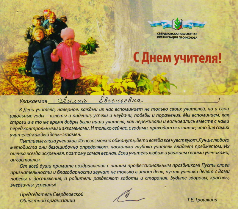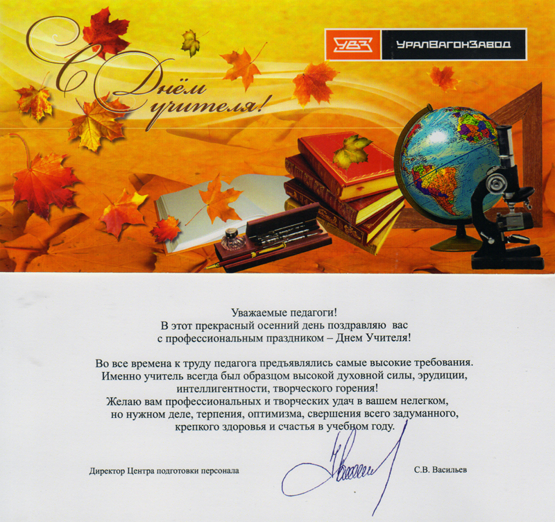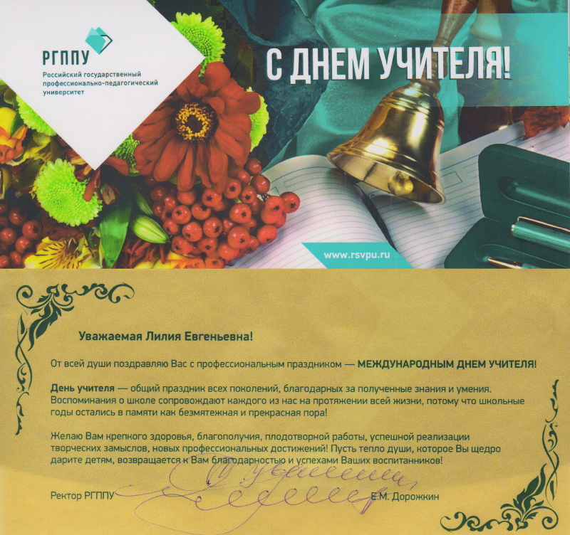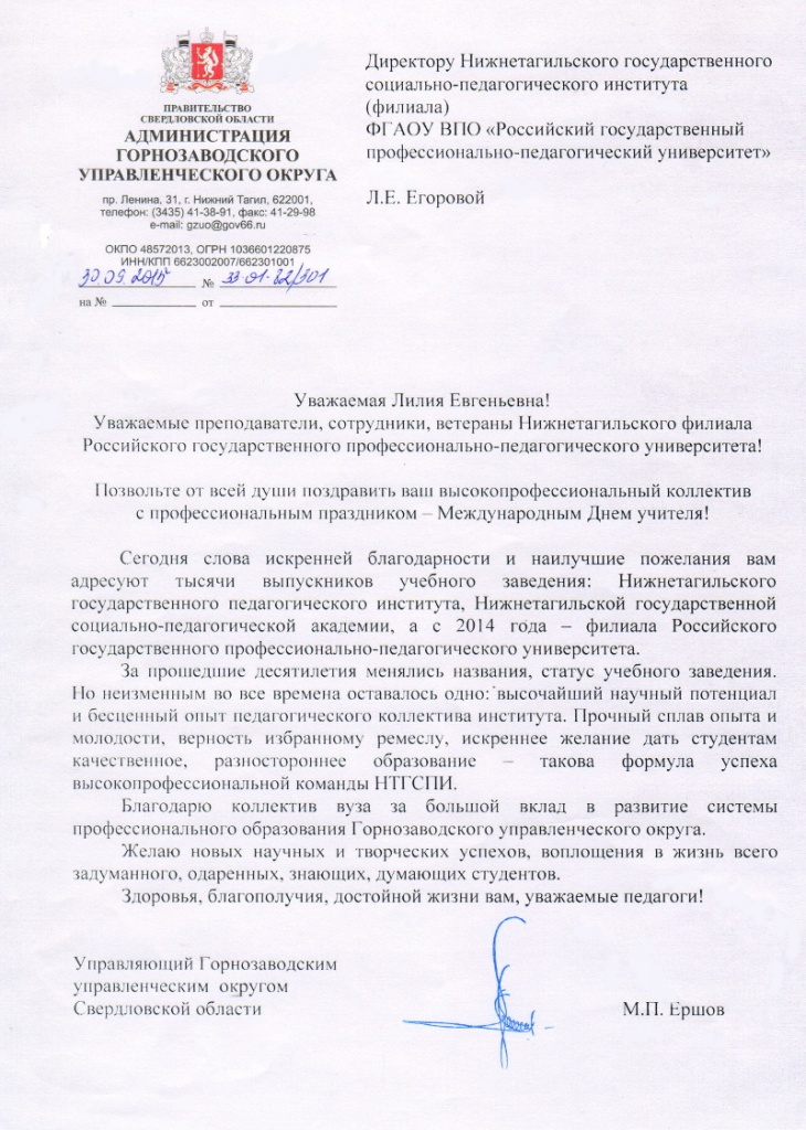 Поздравления от Управляющего Горнозаводским управленческим округом М.П. Ершова, Председателя Свердловской областной организации профсоюза Т.Е. Трошкиной, директора центра подготовки персонала Уралвагонзавода С.В. Васильева и Ректора РГППУ Е.М. Дорожкина в адрес преподавателей и сотрудников филиала РГППУ в г. Нижнем Тагиле.