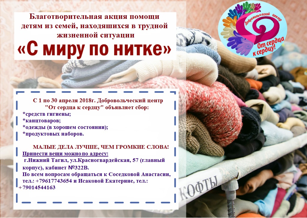 С 1 по 30 апреля вновь была объявлена социальная благотворительная акция «С миру по нитке» в помощь детям из семей, находящихся в трудной жизненной ситуации. Помощь уже оказана Социально-реабилитационному центру для несовершеннолетних Тагилстроевского района, Благотворительному фонду «Возрождение».
