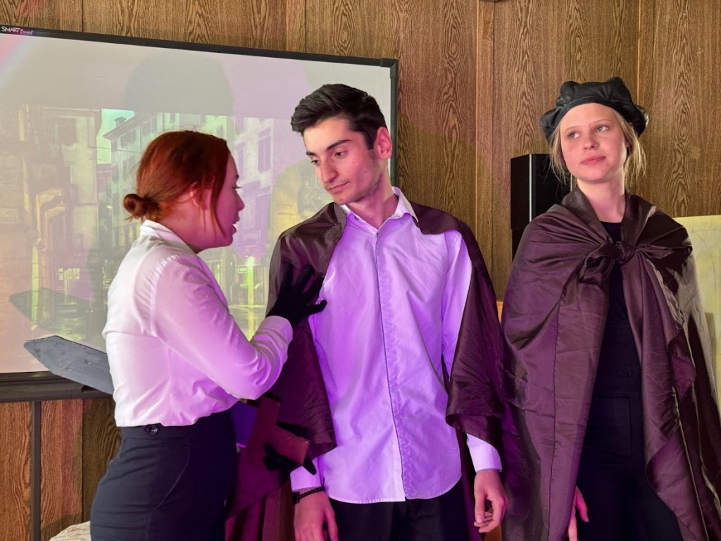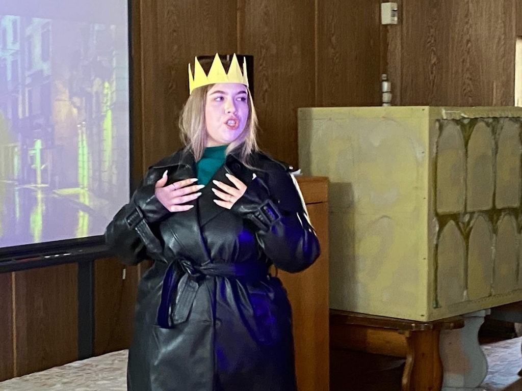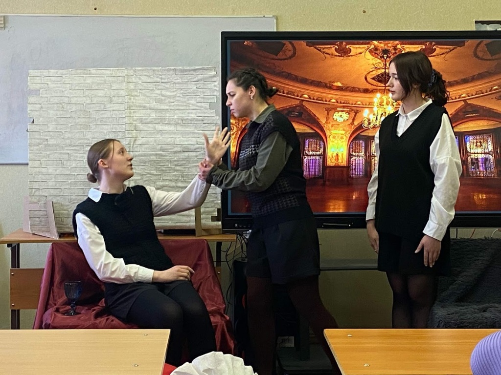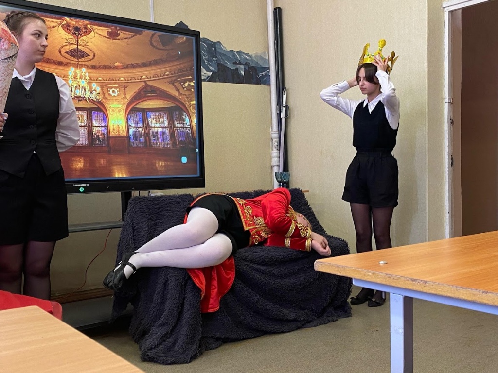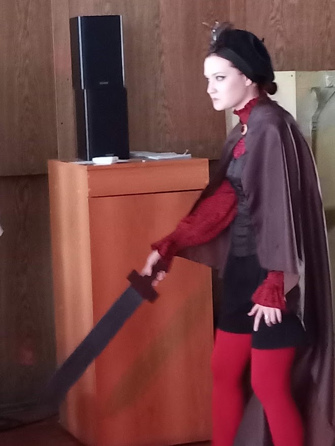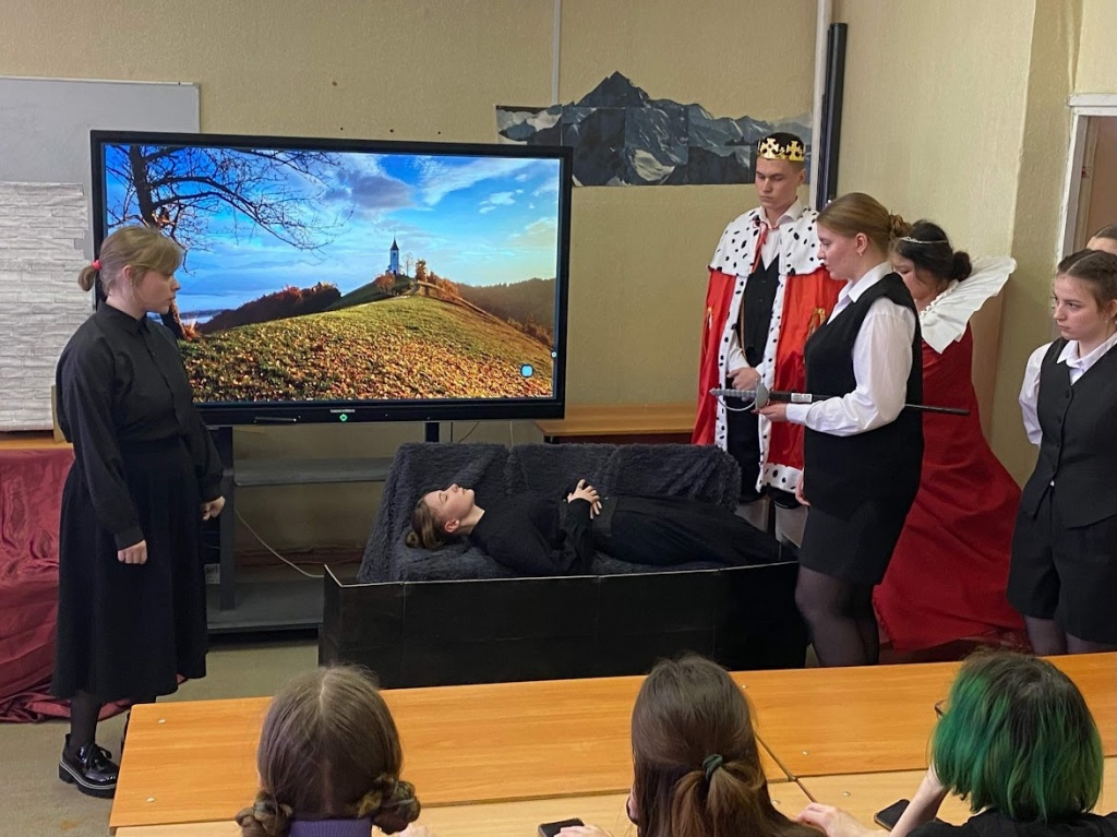 С каждым разом поклонники театра придумывают все более креативные способы представления литературных произведений любимых авторов. На этот раз особенно отличились студенты первого курса. Перед началом выступления был показан видеоролик, который кратко воспроизводил часть сюжета трагедии «Гамлет». Затем действие перешло непосредственно на импровизированную сцену. Замечательны были декорации и костюмы, а музыка и визуальный ряд удачно дополняли выступление. Впечатлил масштаб проделанной работы. Студентам удалось создать атмосферу эпохи, вызвать ощущения того, как будто зритель находится вместе с героями и проживает все эмоции вместе с ними. Король Клавдий (Никита Сторожев), с развевающейся накидкой и удивительно громким голосом, заставил каждого из зрителей покрыться мурашками. Королева Гертруда (Наталия Чебоненко) своей чувственной игрой задела каждого до глубины души. Особенно поразил всех присутствующих принц Гамлет в исполнении Анны Новиковой, настолько глубоко удалось прочувствовать ей этот образ. Хороши были и другие актеры. Запомнился всем интриган Полоний в исполнении Кристины Кузьминой; актеры, сыгравшие «Мышеловку» по просьбе Гамлета, и другие действующие лица.
