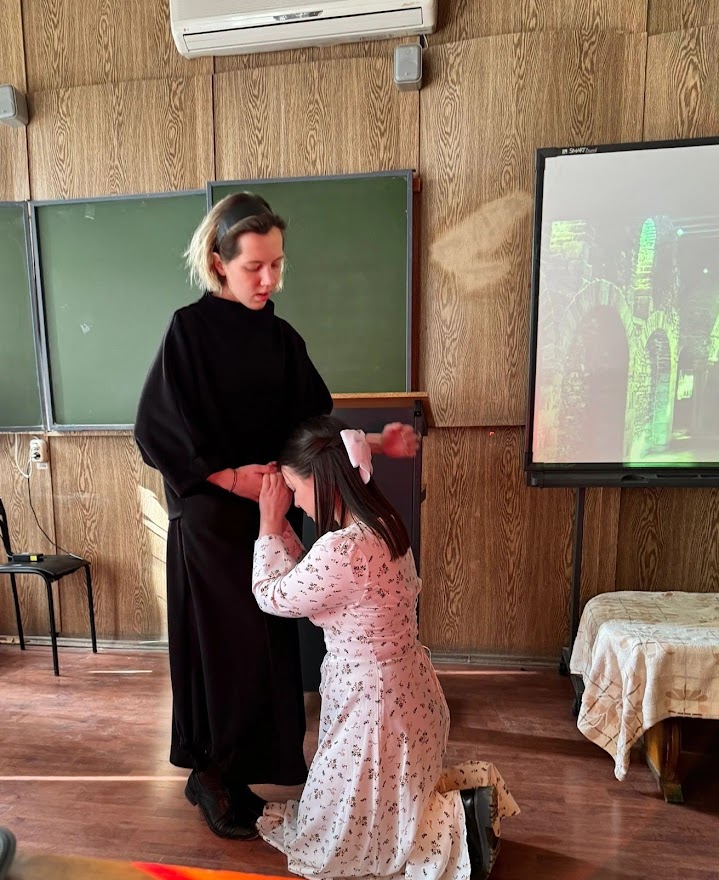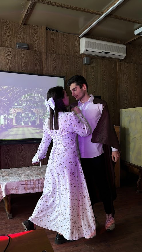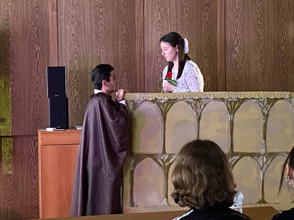 Затем студенты второго курса представили вниманию зрителей свою версию трагедии Шекспира «Ромео и Джульетта». Несмотря на то, что некоторые из присутствующих уже были знакомы с этой интерпретацией, она не могла не тронуть всех участников вечера. На этот раз произошла небольшая замена актерского состава, но от этого общий замысел инсценировки нисколько не пострадал. Те, кто уже видел постановку, с большим удовольствием посмотрели ее вновь и остались при первоначальном мнении. Студенты смогли передать трагичную историю юных влюбленных (Ромео – Вургун Рустамов, Джульетта – Мария Клебановская), их борьбу с миром и запретами. Следует отметить колоссальную работу художников-постановщиков. Дизайн декораций и костюмов показал, с какой серьезностью подошли студенты к постановке, чего стоит один только балкон, созданный для сцен встречи главных героев – Ромео и Джульетты. Замечательно была подобрана музыка. Впечатлили сцены поединков. Все актеры удачно воплотили образы персонажей, но особо следует отметить экспрессивного Тибальта в исполнении Александры Казариновой.